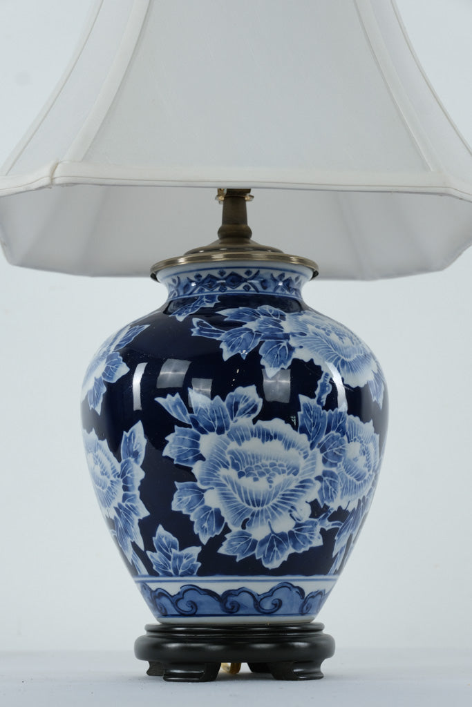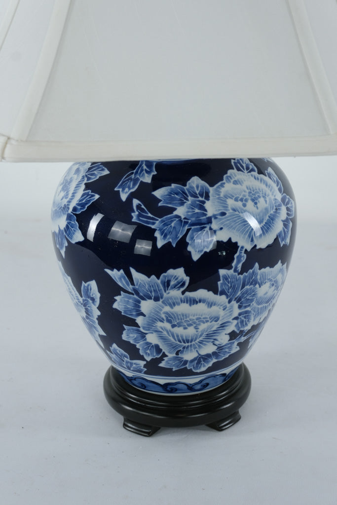 Classic elegance meets timeless craftsmanship in this beautiful blue and white ginger jar table lamp. Featuring a deep cobalt background adorned with intricate white peony blossoms, this lamp captures the refined artistry of traditional porcelain design. Mounted on a carved wooden base and topped with a crisp white bell shade, it makes a graceful addition to any living room, entryway, or bedside table.