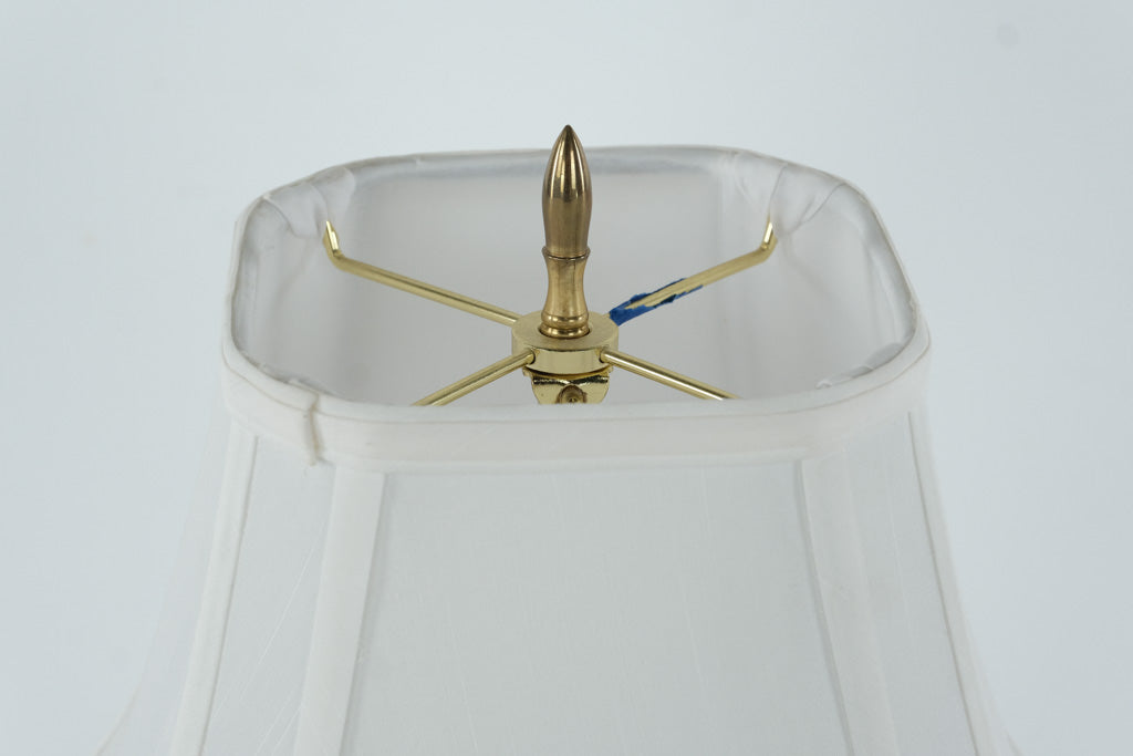 Includes white fabric bell shade with finial