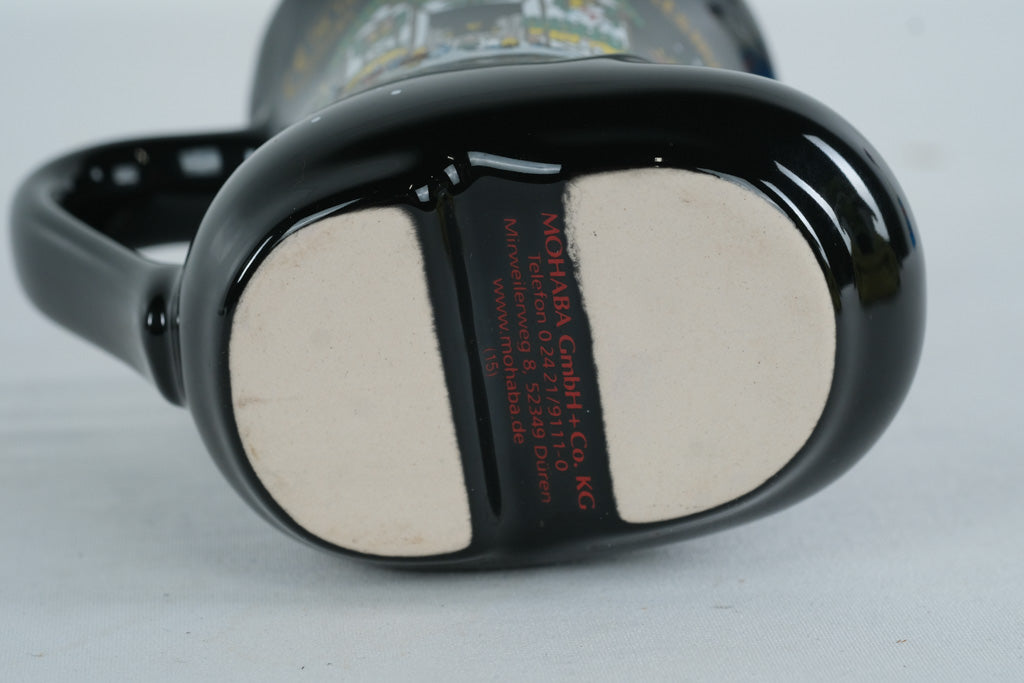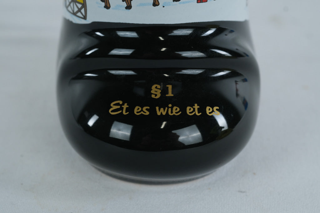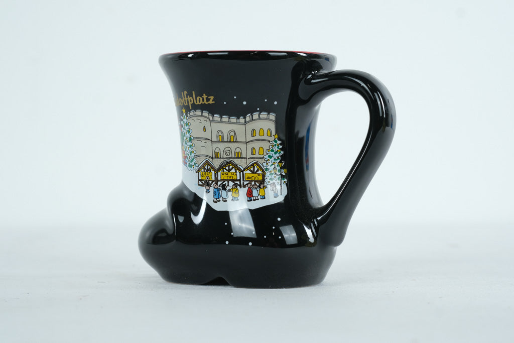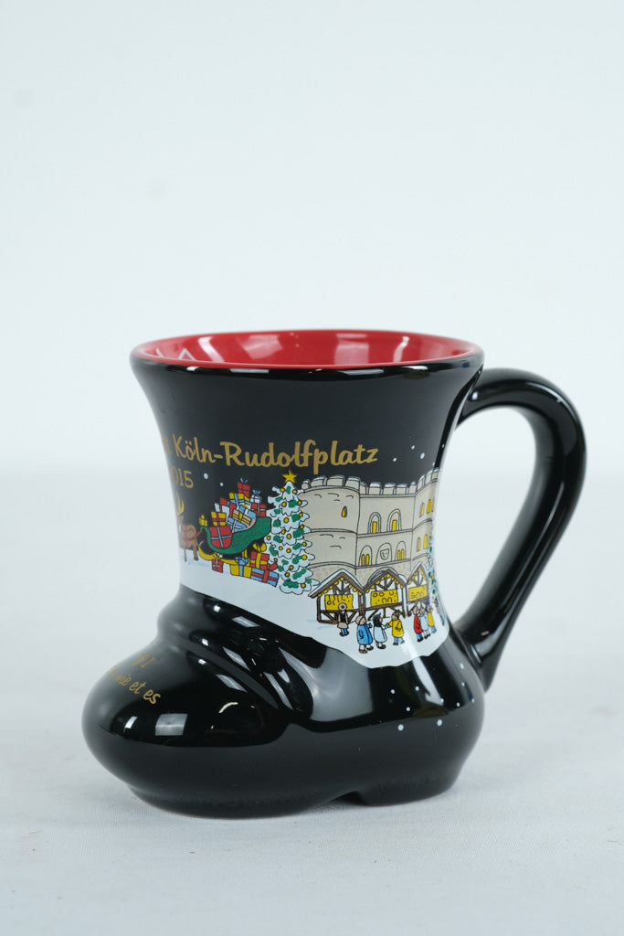 This whimsical ceramic mug is shaped like a traditional boot, created for the Weihnachtsmarkt Köln (Cologne Christmas Market) 2015. Finished in glossy black with a bright red interior, the mug features charming illustrated scenes of the Cologne market, including festive stalls, reindeer, and local landmarks.