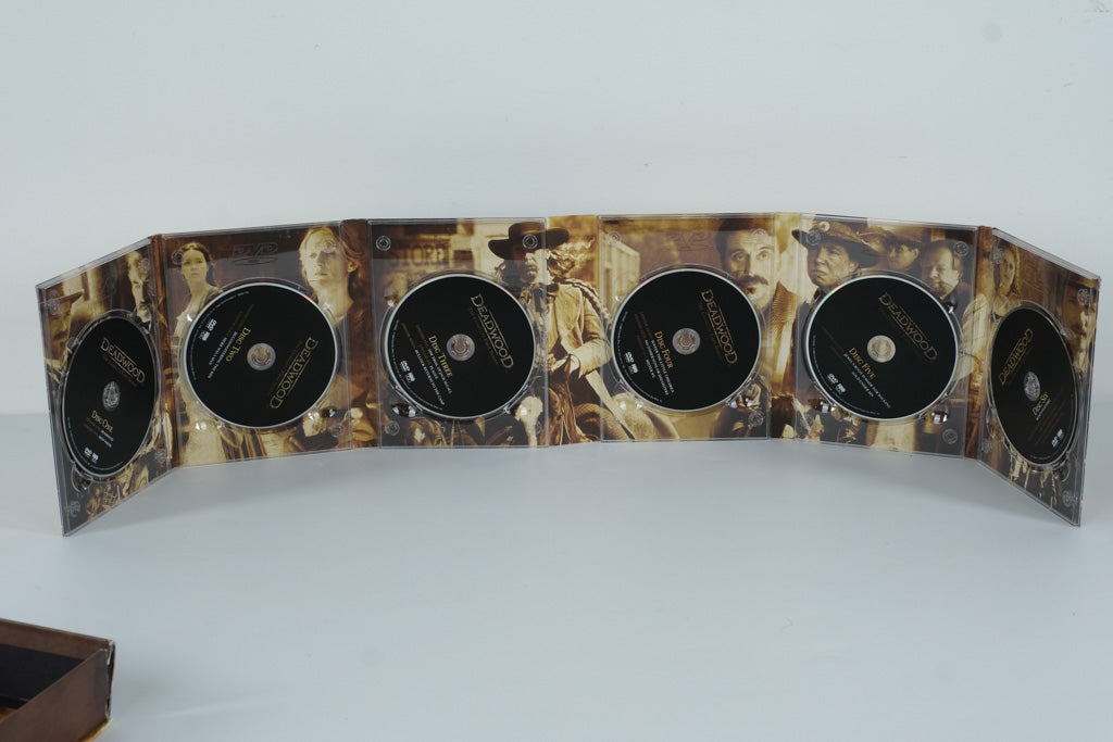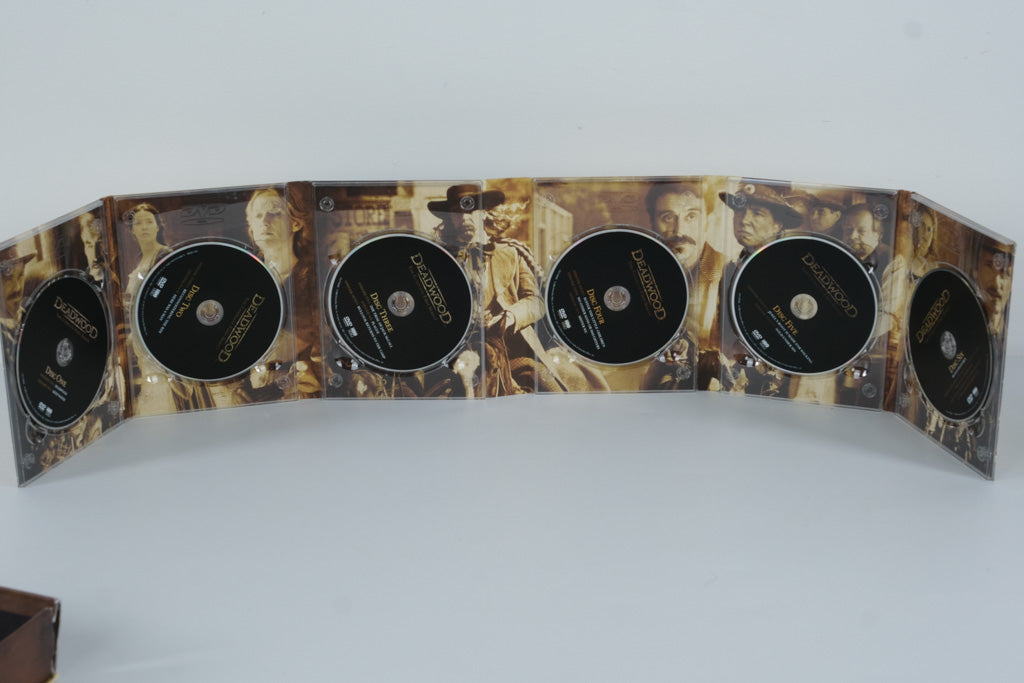 Step into the gritty, gold-rush world of HBO’s Deadwood with this complete Season 1 DVD set. This six-disc collection captures every episode of the groundbreaking Western drama, complete with rich character portraits printed behind each disc. The fold-out interior artwork remains impressive, showcasing the show’s iconic cast and immersive storytelling.