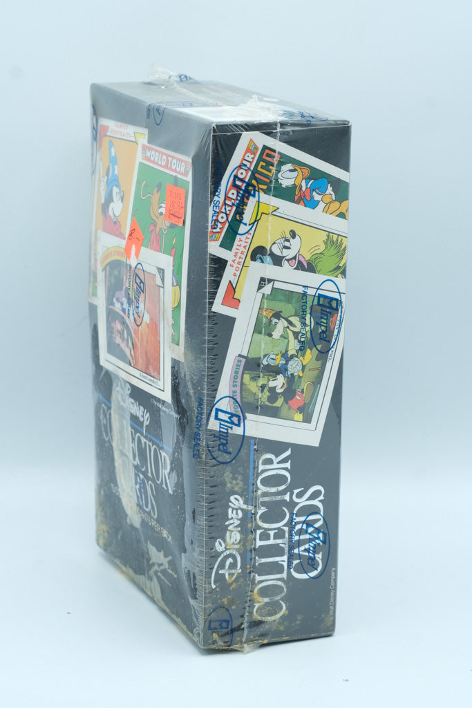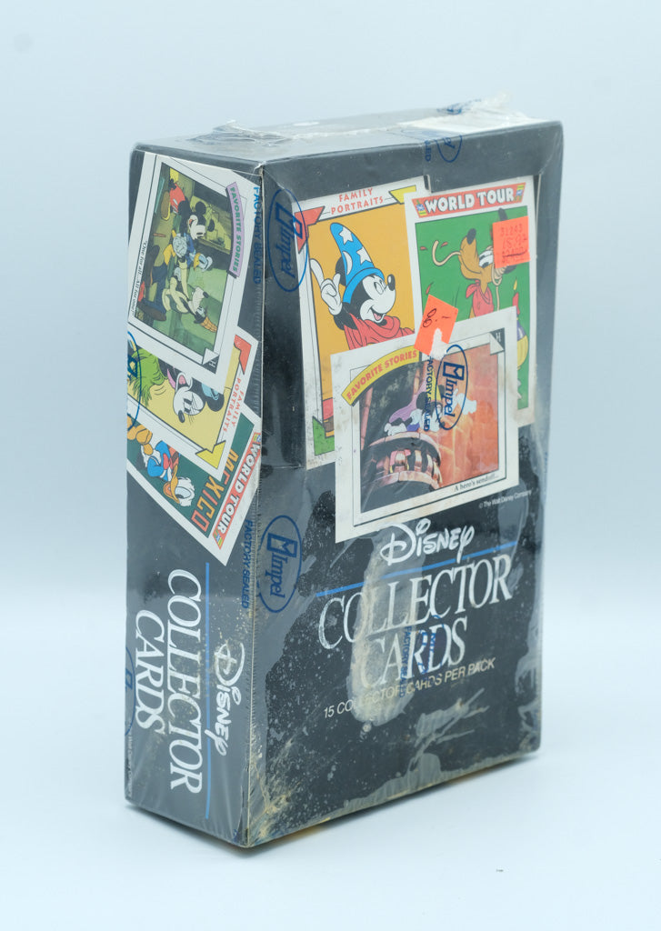 This Disney Collector Cards box by Impel remains factory sealed in its original shrink wrap, featuring classic Disney artwork and themed card series such as Family Portraits, World Tour, and Favorite Stories. These packs are known for their nostalgic designs and broad appeal to Disney collectors and vintage trading card enthusiasts.