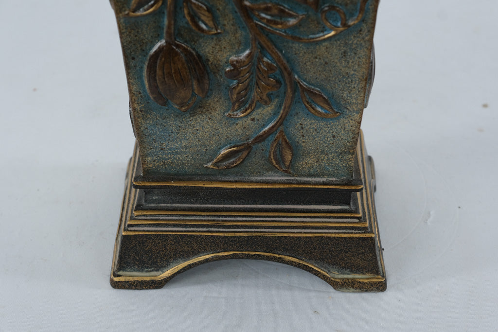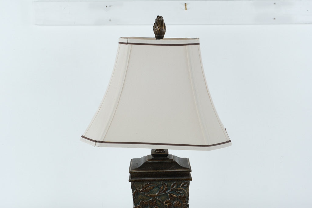 Elegant and artful, this embossed bronze table lamp brings a refined touch of vintage charm to any room. The rectangular base features a raised floral motif with soft teal undertones and bronze accents, creating an antiqued patina effect that pairs beautifully with its warm cream fabric shade. A sculpted finial completes the look, making it a perfect statement piece for traditional or transitional interiors.