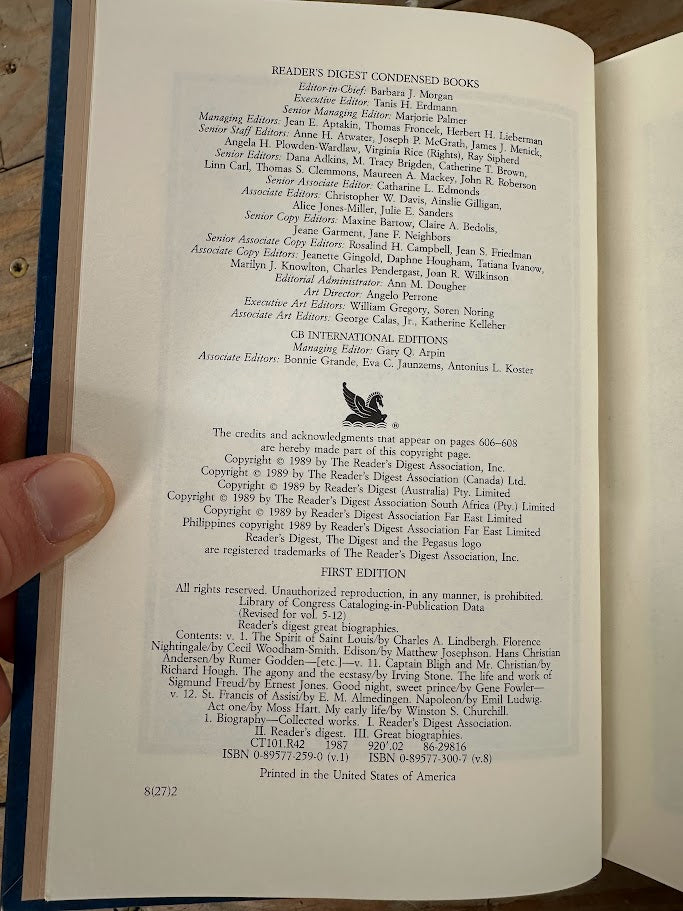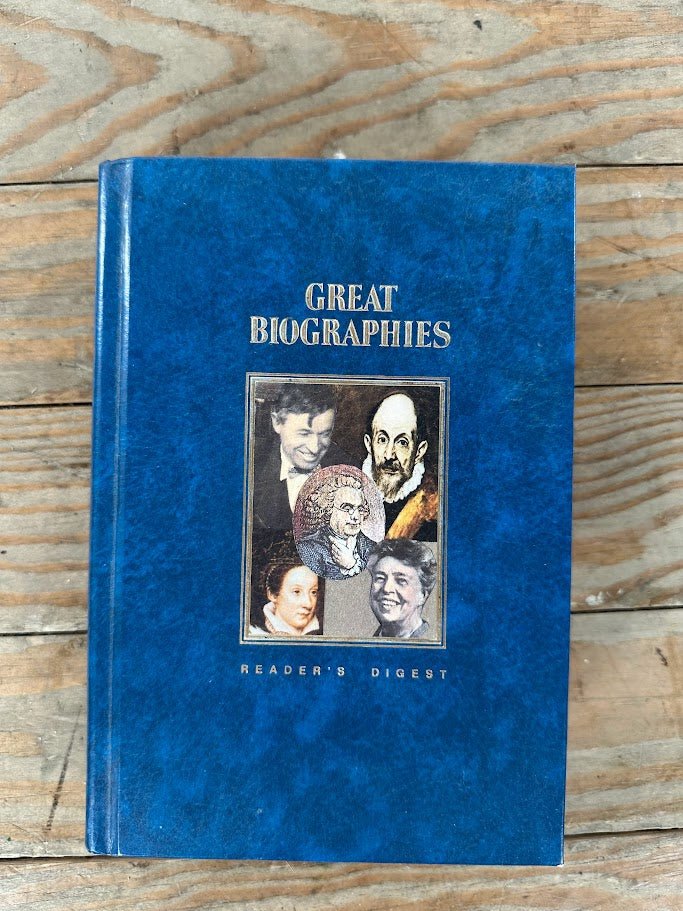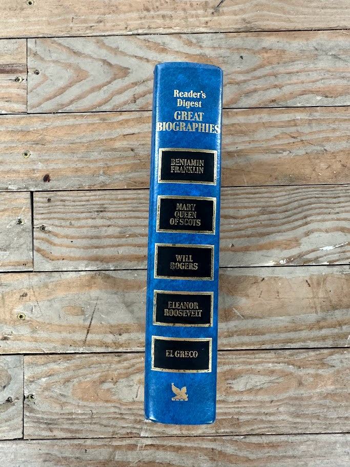This handsome hardcover volume from Reader’s Digest brings together condensed biographies of some of history’s most influential figures. Great Biographies includes engaging profiles of Benjamin Franklin, Mary Queen of Scots, Will Rogers, Eleanor Roosevelt, and El Greco. Bound in a classic blue cover with gilt accents, this collection offers accessible, well-edited storytelling ideal for casual reading or display.