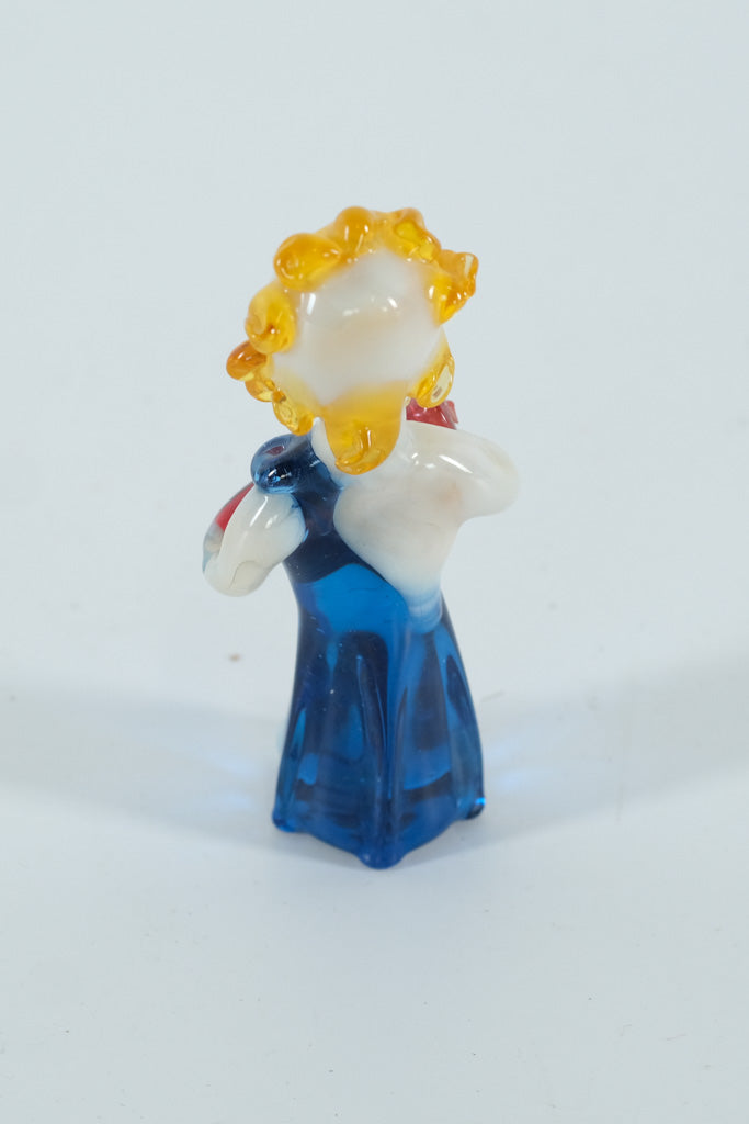This elegant hand-blown art glass clown figurine stands taller than most miniatures at approximately 4 inches, offering graceful proportions and beautiful coloration. Featuring a flowing translucent blue robe, bright golden-yellow curly hair, and a cheerful face, this piece blends classic clown charm with a more refined sculptural style. The clown holds a deep ruby-red prop—possibly a juggling club or theatrical accessory—adding a warm contrast that draws the eye.