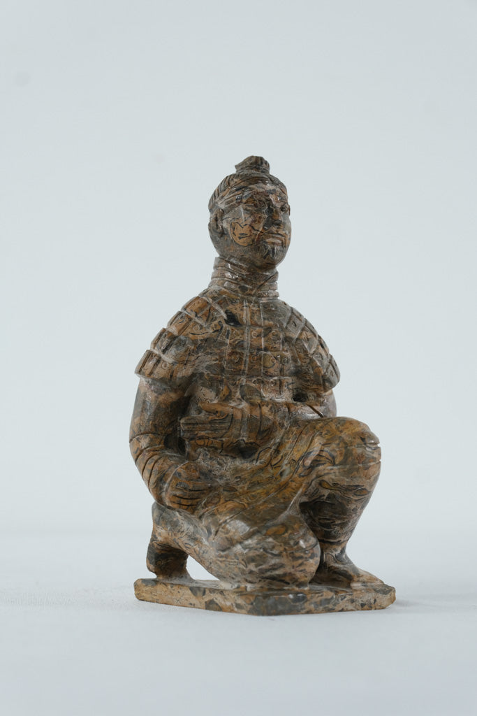 This finely detailed hand-carved stone figure depicts a kneeling Chinese warrior in the traditional style of the famed Terracotta Army. Carved from richly mottled brown stone, the sculpture showcases incised armor plates, a topknot hairstyle, and carefully modeled facial features, all rendered with impressive precision at a small scale.