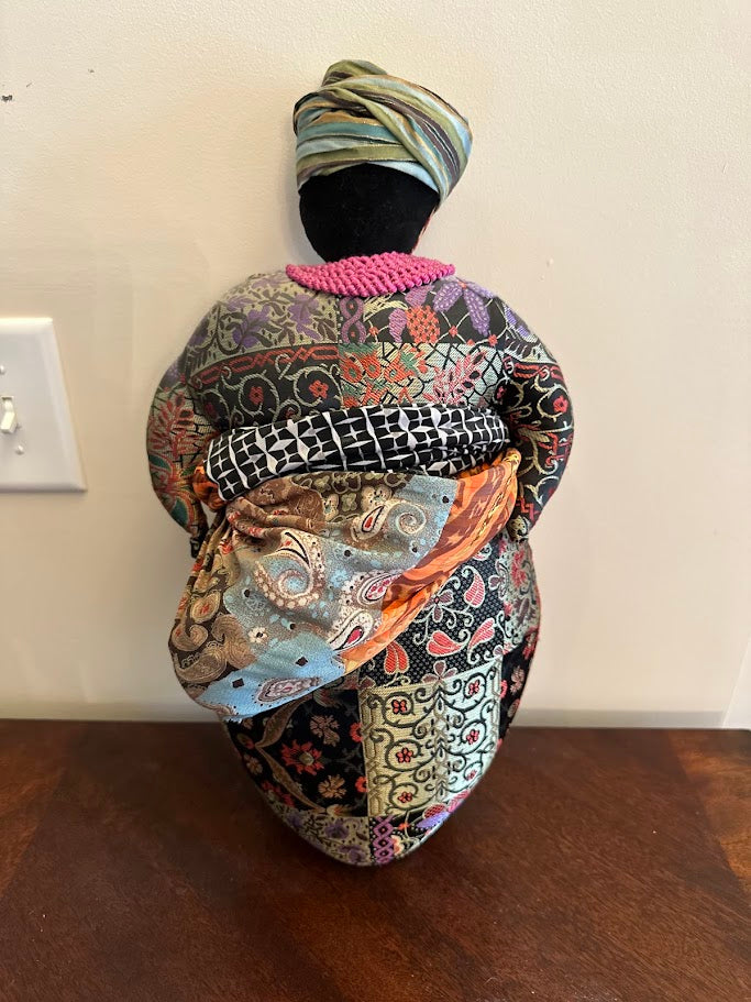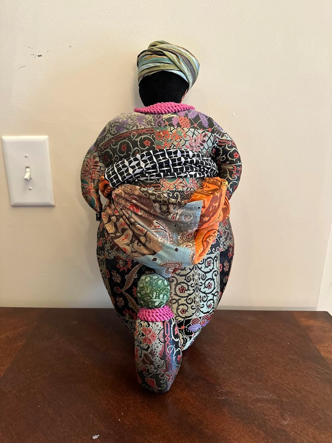 This is not a toy or conventional doll, but a decorative fiber sculpture intended for display as folk art or outsider art. Its scale and presence make it a compelling statement piece for collectors of handmade, narrative-driven artwork.