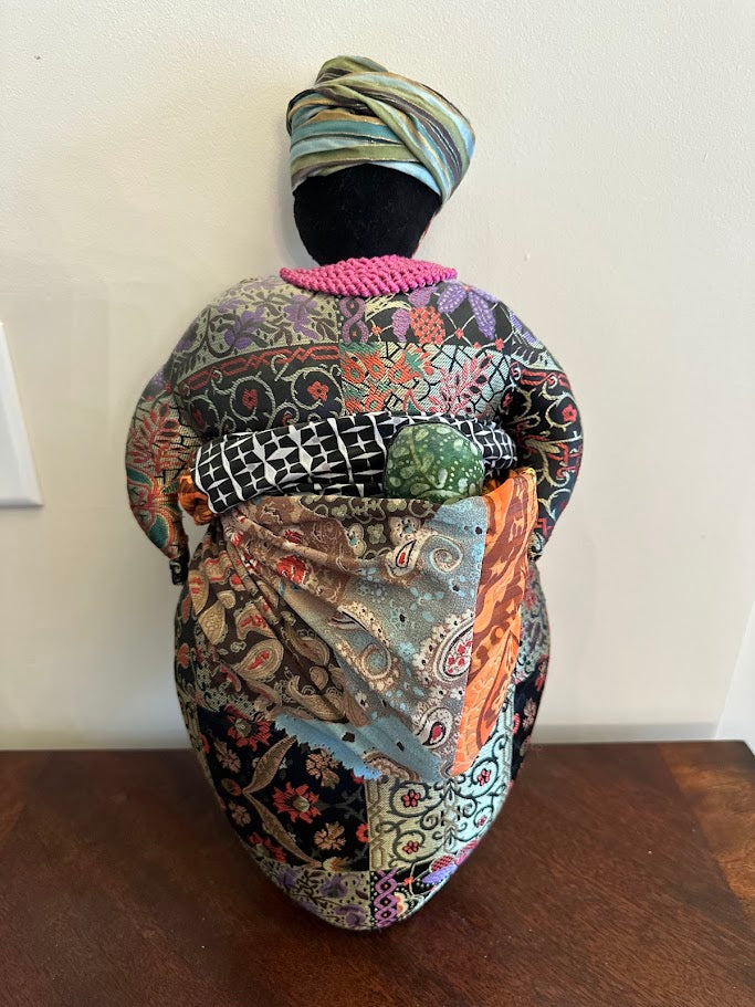 Expressive and deeply evocative, this handmade folk art textile sculpture depicts a woman carrying a child, rendered in a soft sculptural form using richly patterned fabrics. The full-figured woman stands with quiet strength, while the child is secured against her body in a wrapped sling—an intimate and timeless portrayal of care, protection, and connection.