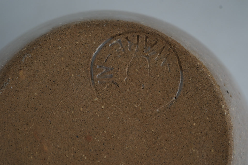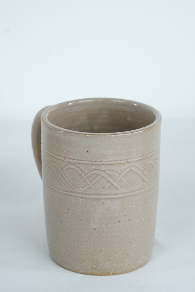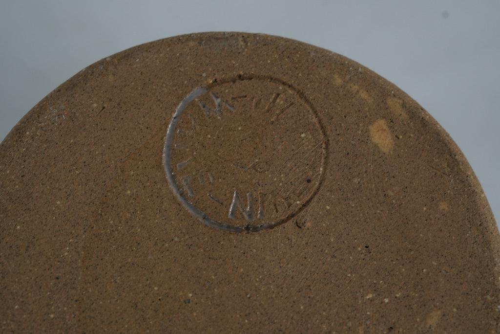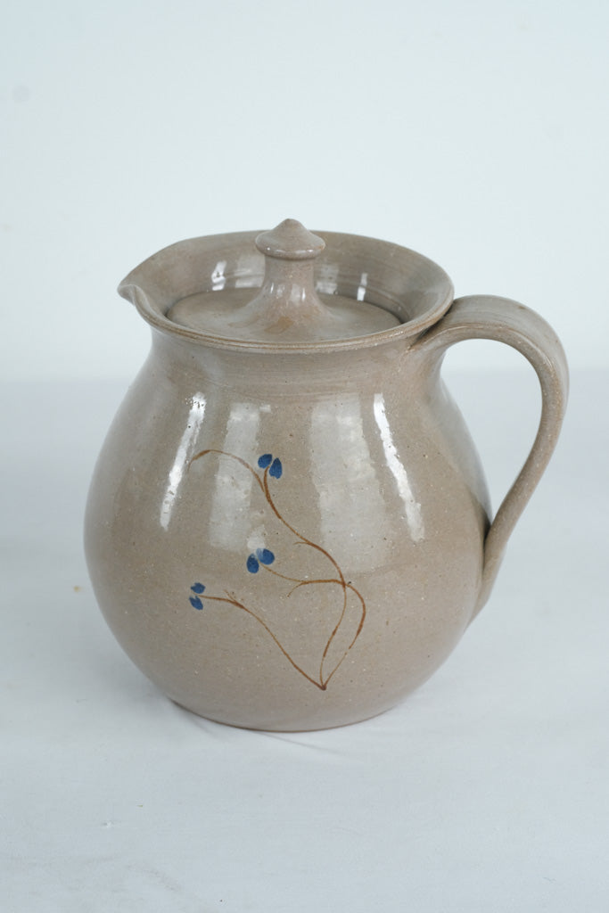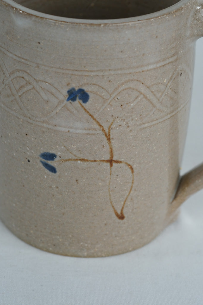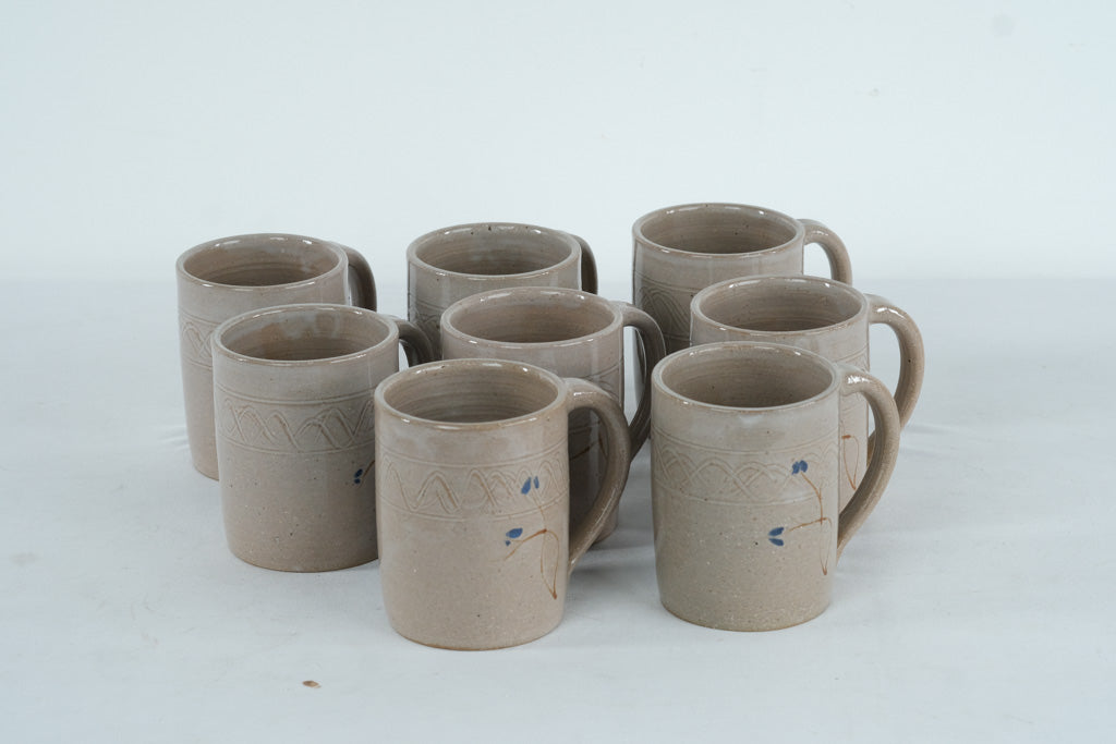 This handsome Jugtown Pottery stoneware set embodies the quiet beauty and craftsmanship of traditional North Carolina pottery. Finished in a warm, earthy gray-beige glaze, the pieces are accented with simple hand-painted cobalt blue floral motifs and subtle incised banding near the rims, giving the set a timeless, rustic elegance.
