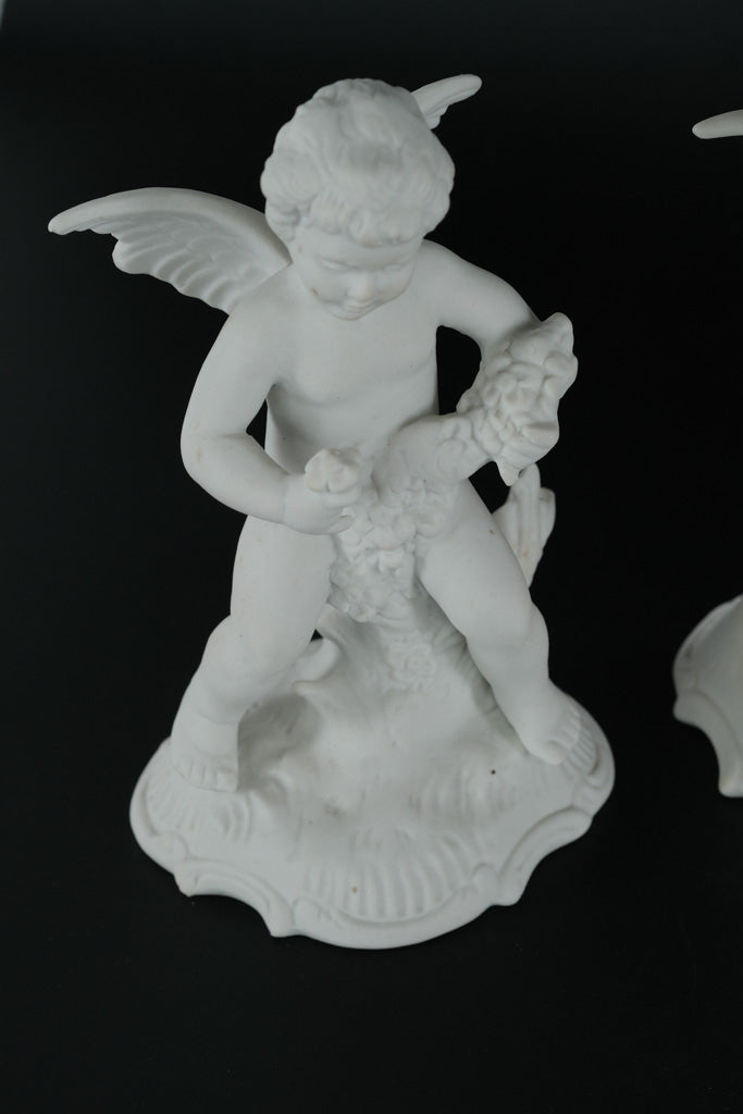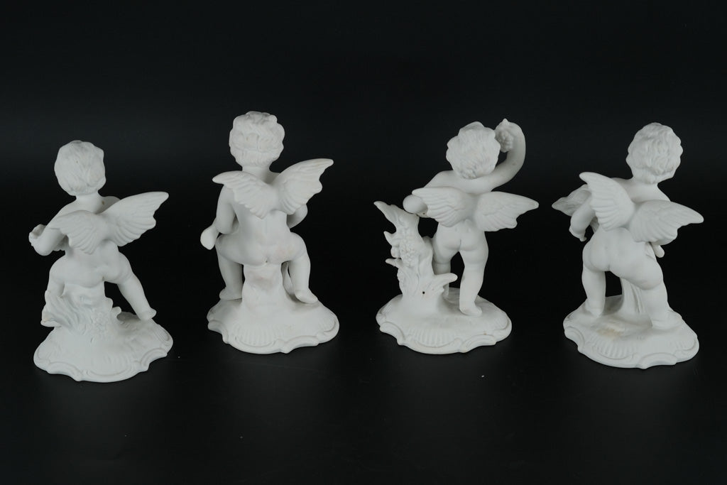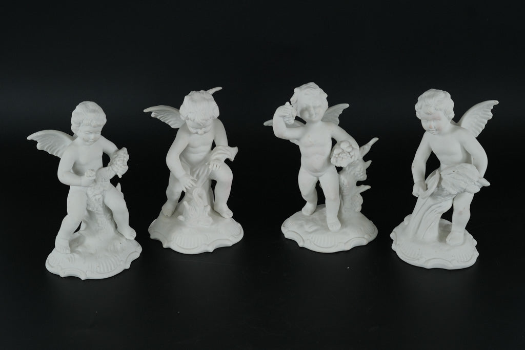 This enchanting set of four Kaiser Germany bisque porcelain cherubs captures the elegance and purity that made Kaiser renowned for its sculptural artistry. Each cherub is delicately modeled in fine white matte bisque, showcasing detailed wings, expressive poses, and beautifully rendered bases. Standing approximately 6 inches tall, the figures appear to represent symbolic themes such as abundance, harvest, play, and warmth.