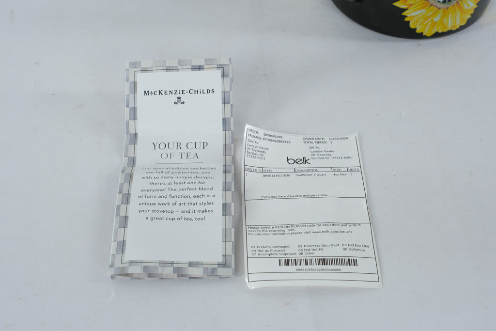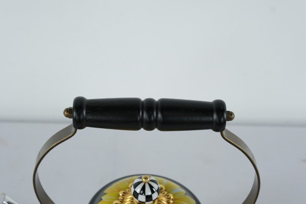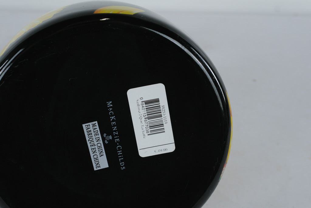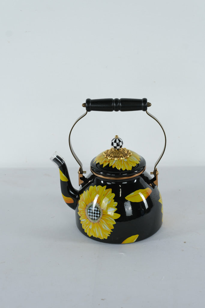 Brighten your kitchen with the radiant charm of the MacKenzie-Childs Sunflower 2-Quart Tea Kettle. This hand-decorated enamel kettle combines functional artistry with everyday delight, featuring bold sunflower blooms against a glossy black background. The signature MacKenzie-Childs courtly check pattern and golden accents on the lid add a whimsical touch that makes tea time feel like a celebration. Perfect for collectors and tea lovers alike, it’s both a conversation piece and a reliable stovetop companion.