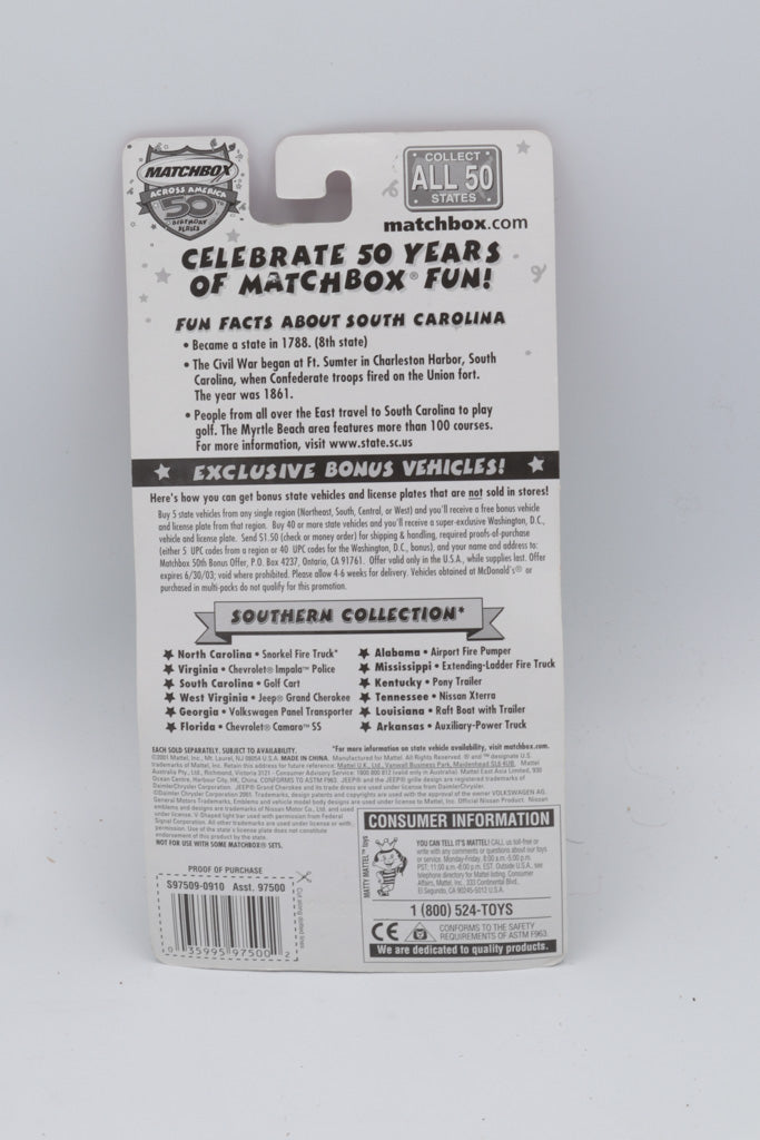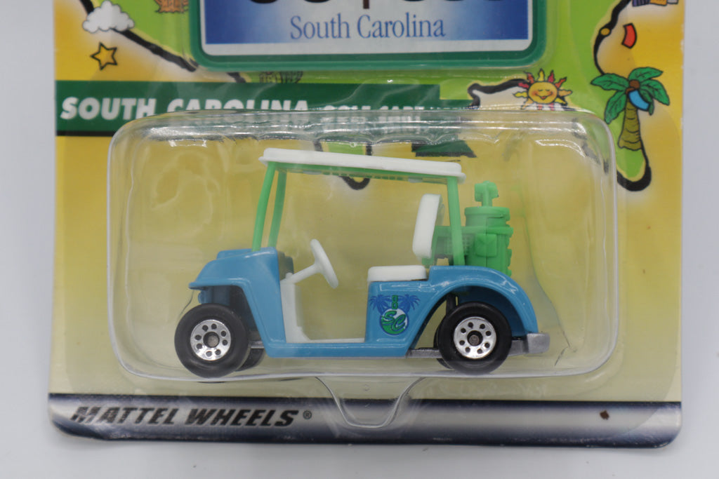 Celebrate the Palmetto State with this Matchbox Across America 50th Birthday Series collectible from 2002! This die-cast Golf Cart model honors South Carolina’s laid-back coastal culture and iconic palmetto imagery. It features a two-tone blue design with beach graphics and includes the decorative “SC 008” license plate, marking South Carolina as the 8th state in the Union.