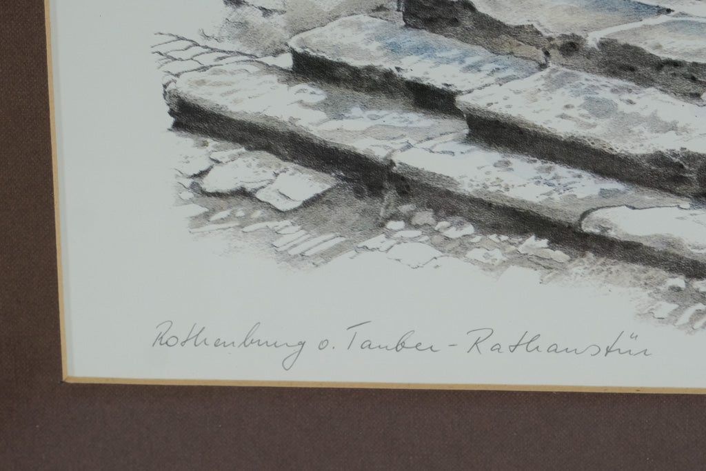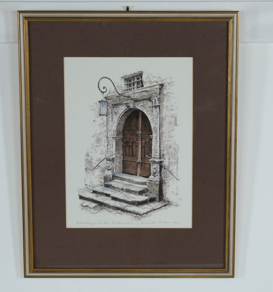 This beautifully detailed print by Monika Heller-Cole captures the timeless charm of Rothenburg ob der Tauber, one of Germany’s most picturesque medieval towns. Titled Rathaus Tür (Town Hall Door), it portrays the intricately carved stone doorway and weathered steps of the town’s historic Rathaus, rendered with Heller-Cole’s signature balance of realism and quiet warmth.