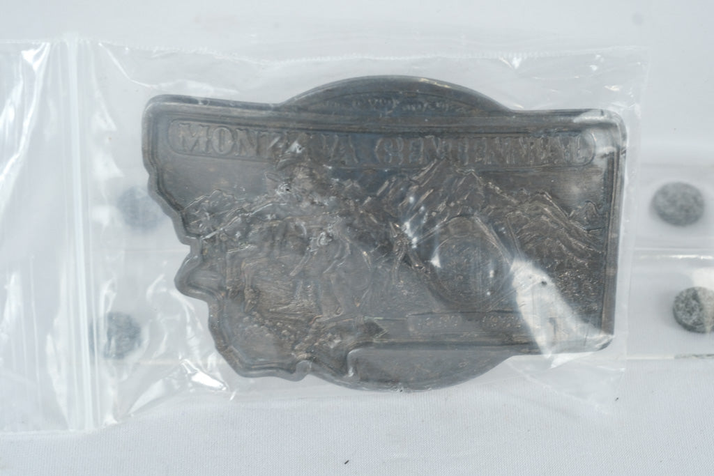 Celebrate a century of Montana heritage with this beautifully crafted Montana Centennial commemorative belt buckle, produced by Montana Silversmiths. This collectible buckle features an intricately detailed frontier scene with a cowboy on horseback, mountain backdrop, and state seal, all shaped in the outline of Montana. Finished in sterling silver plate, it was created to honor Montana’s 100th anniversary (1889–1989) and remains a timeless symbol of Western pride and craftsmanship.