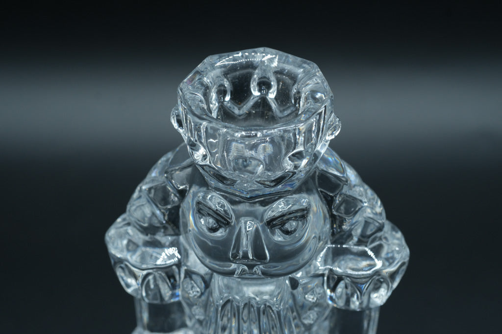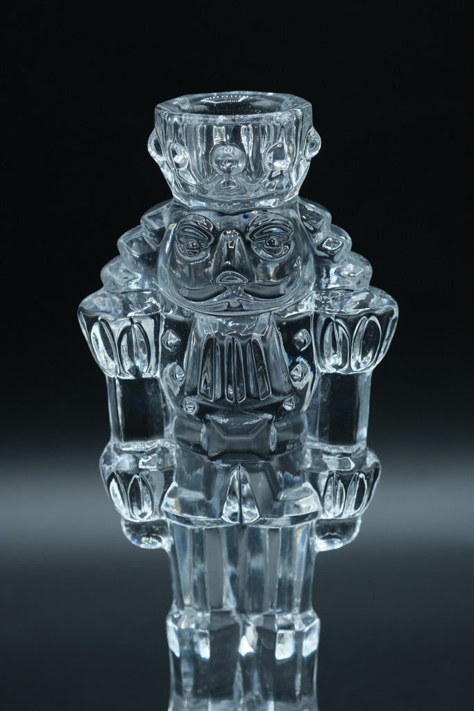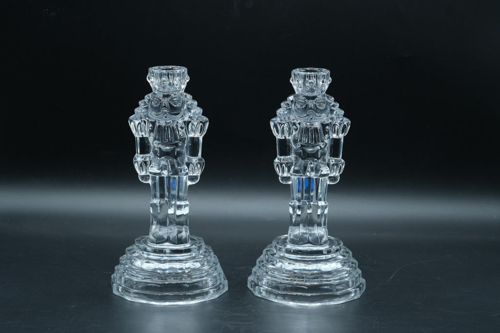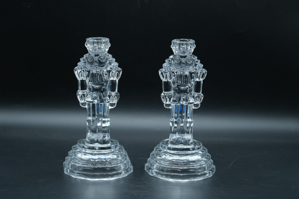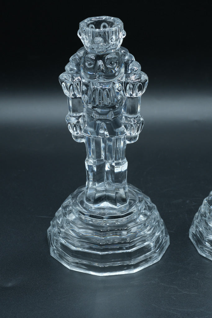 Each candlestick features a finely detailed figural nutcracker, complete with crown-style candle cup, stylized facial features, articulated arms, and a substantial tiered base that provides excellent stability. The clear lead crystal construction offers strong clarity and light refraction, making these especially striking when displayed with candles.
