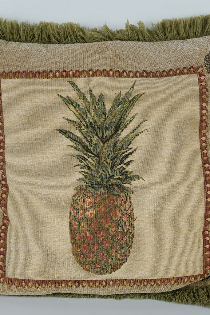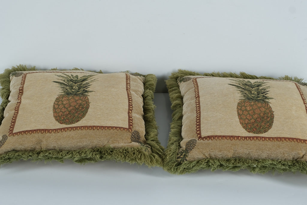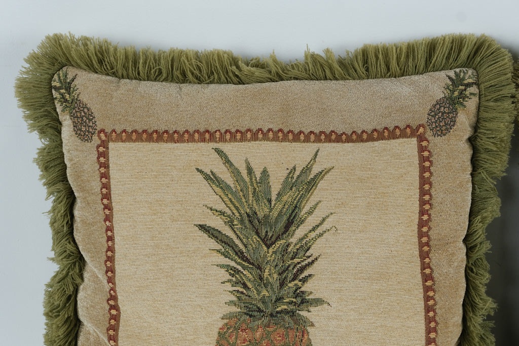 Brighten your space with this charming pair of 16" pineapple accent pillows, featuring a woven tapestry-style front and lush green fringe trim. The pineapple—long recognized as a symbol of warmth and hospitality—makes these pillows a perfect welcoming touch for living rooms, sunrooms, patios (covered), guest rooms, or tropical/coastal-inspired décor.
