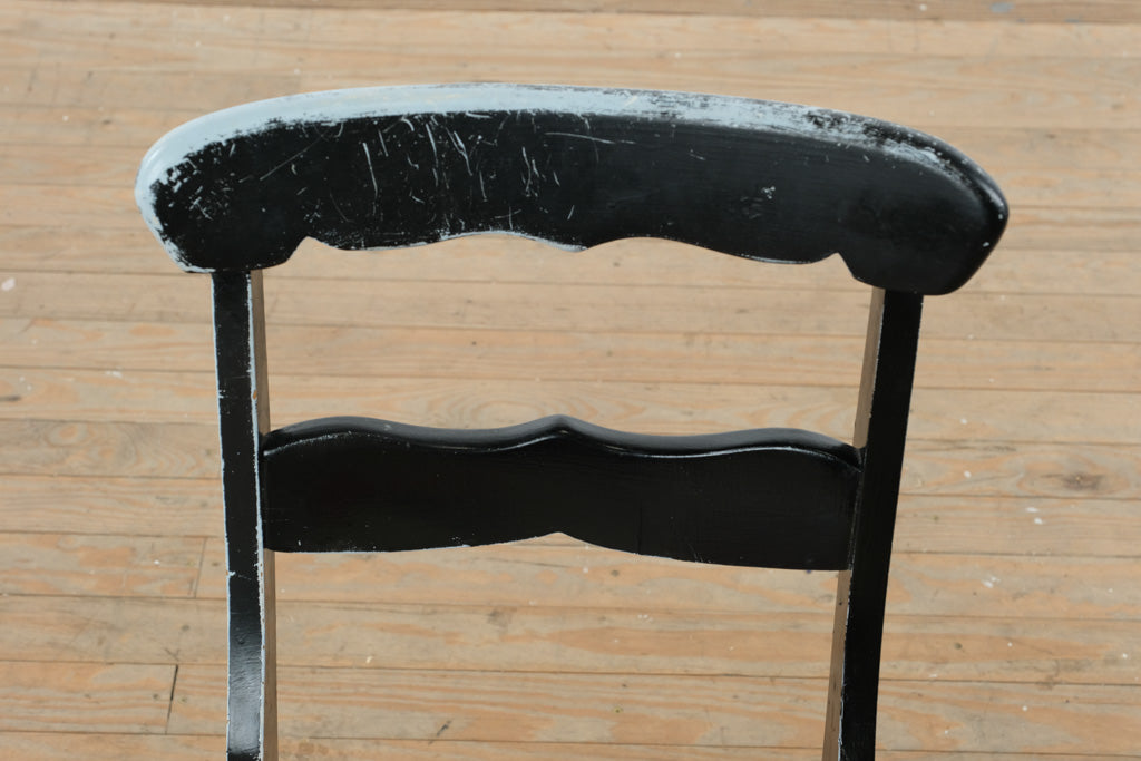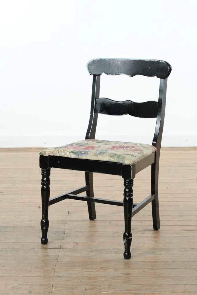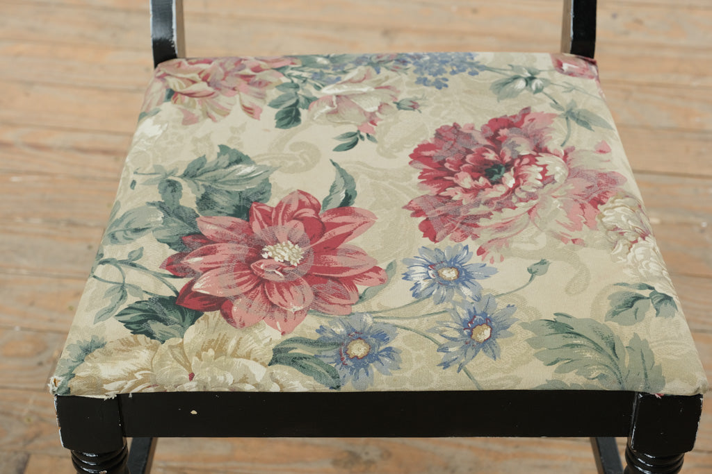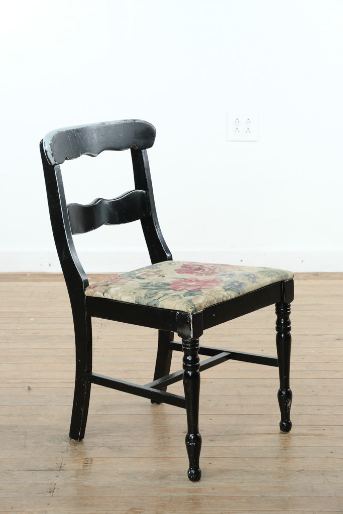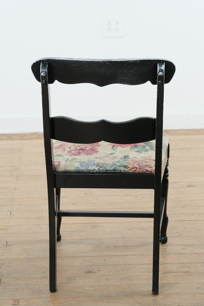 A charming vintage accent chair that blends cottage charm with timeless character, this piece features a shapely black-painted frame and a floral upholstered seat that brings warmth and personality to any space. Its graceful silhouette and inviting pattern make it an effortlessly appealing addition to both classic and eclectic interiors.