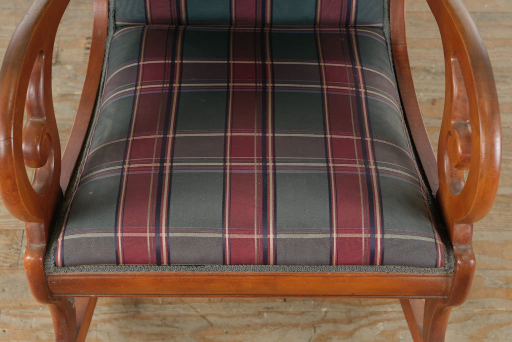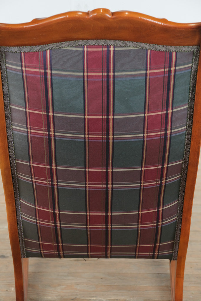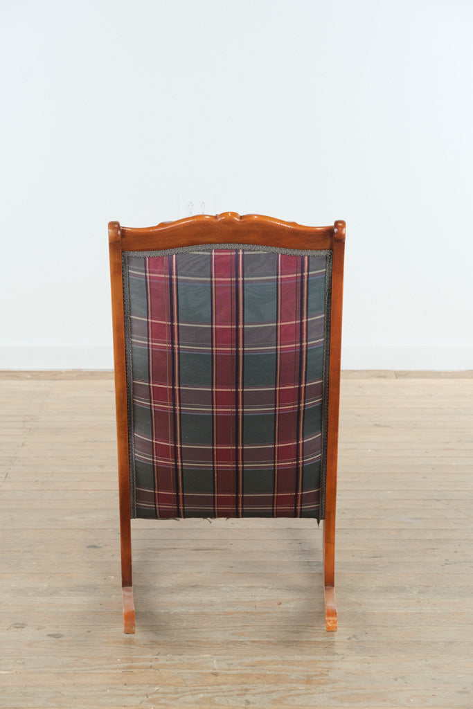 With its gently curved rockers and elegantly scrolled arms, this chair offers a relaxed sitting experience rooted in traditional design. The tall, supportive back and generously padded seat are upholstered in a rich plaid fabric, blending deep greens, burgundy, and muted neutrals for a look that feels both inviting and enduring.
