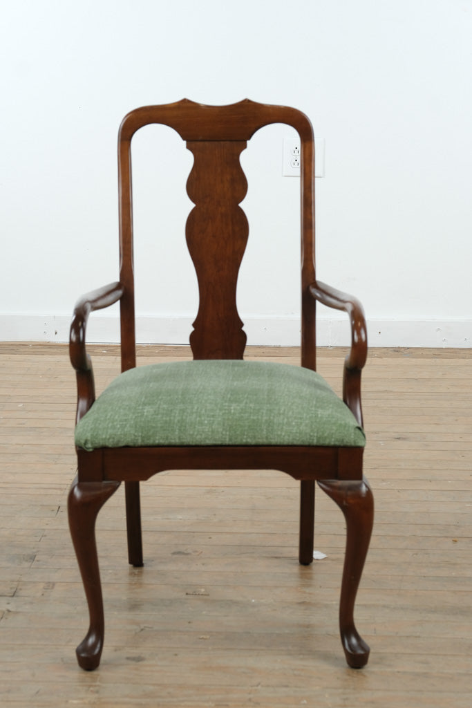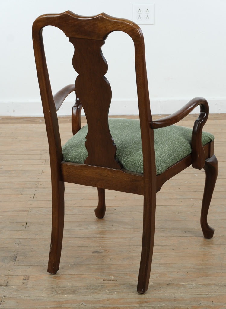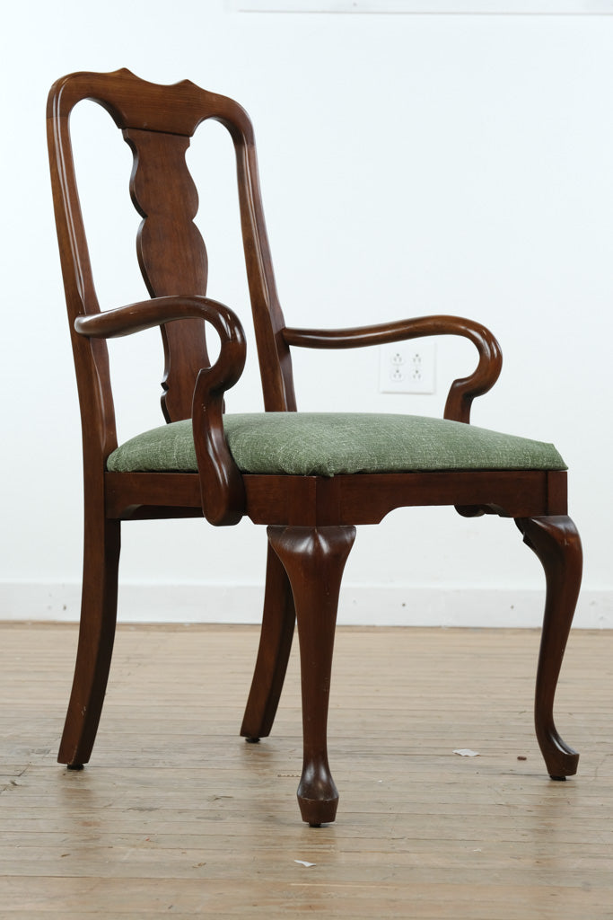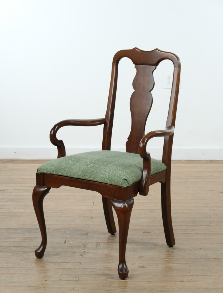 A refined blend of traditional craftsmanship and timeless elegance, this solid wood armchair showcases graceful Queen Anne–inspired lines paired with a fresh green upholstered seat that adds warmth and subtle color. The gently curved arms, sculpted cabriole legs, and shaped splat back create a balanced silhouette that feels equally at home in classic dining rooms, libraries, or thoughtfully layered living spaces.
