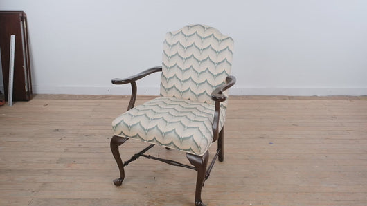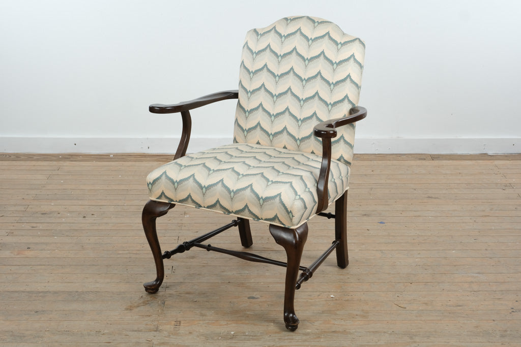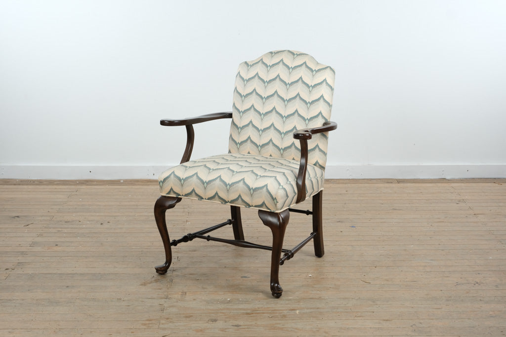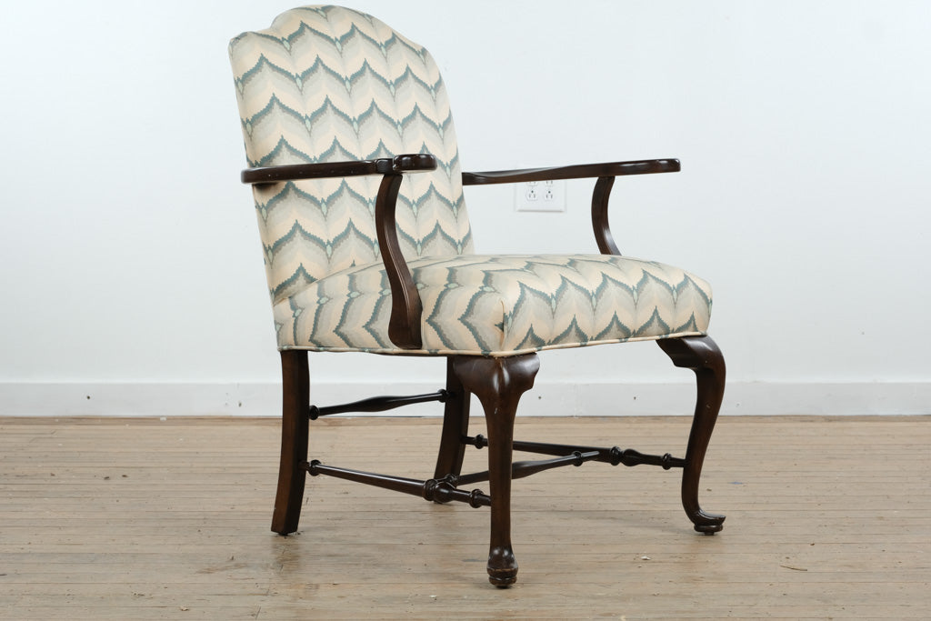 Expertly constructed with a solid wood frame, this chair reflects Ethan Allen’s long-standing reputation for quality craftsmanship and thoughtful design. The gently curved legs, shaped arms, and turned stretchers provide classic structure, while the upholstered seat and back feature a soft, tailored pattern in soothing neutral tones. High-quality cushioning ensures a supportive yet comfortable sit, making this chair as functional as it is elegant.