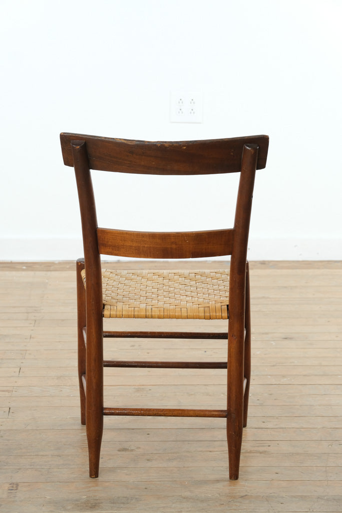 Crafted from solid wood with a warm, medium-brown finish, the chair features a classic ladder-back form and a woven fiber seat in a tight, traditional basket pattern. The proportions are balanced and refined, giving it a timeless utilitarian elegance characteristic of early farmhouse and shaker-style seating.