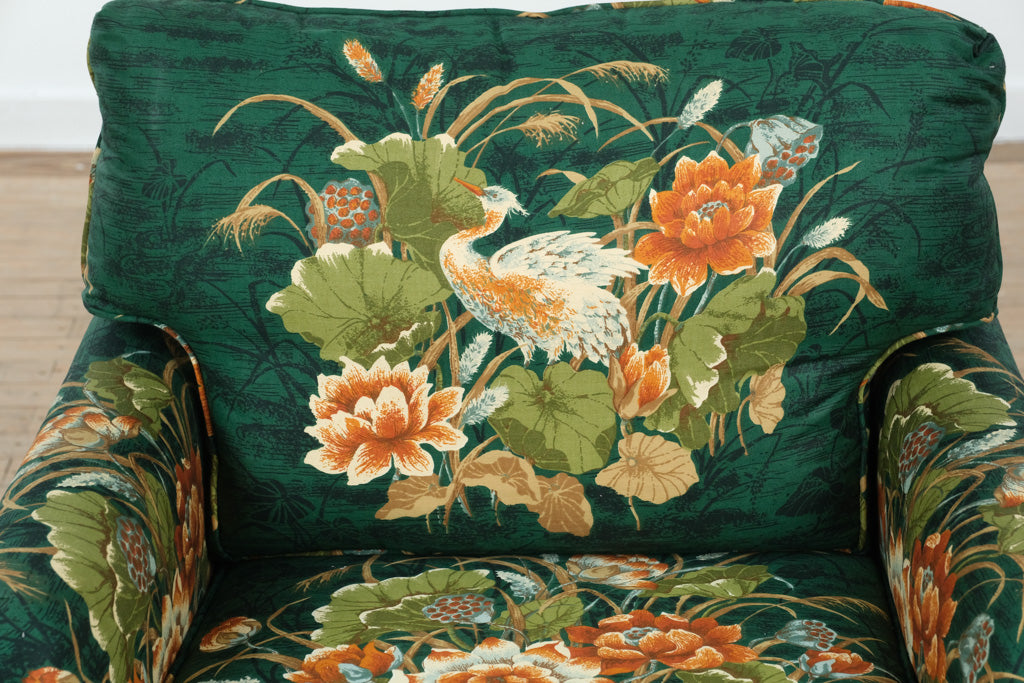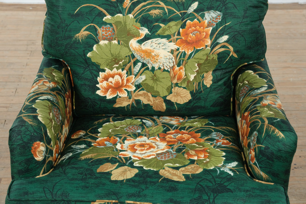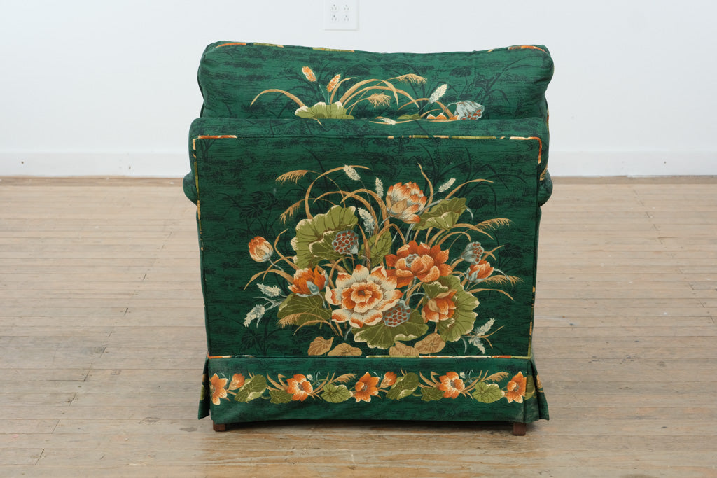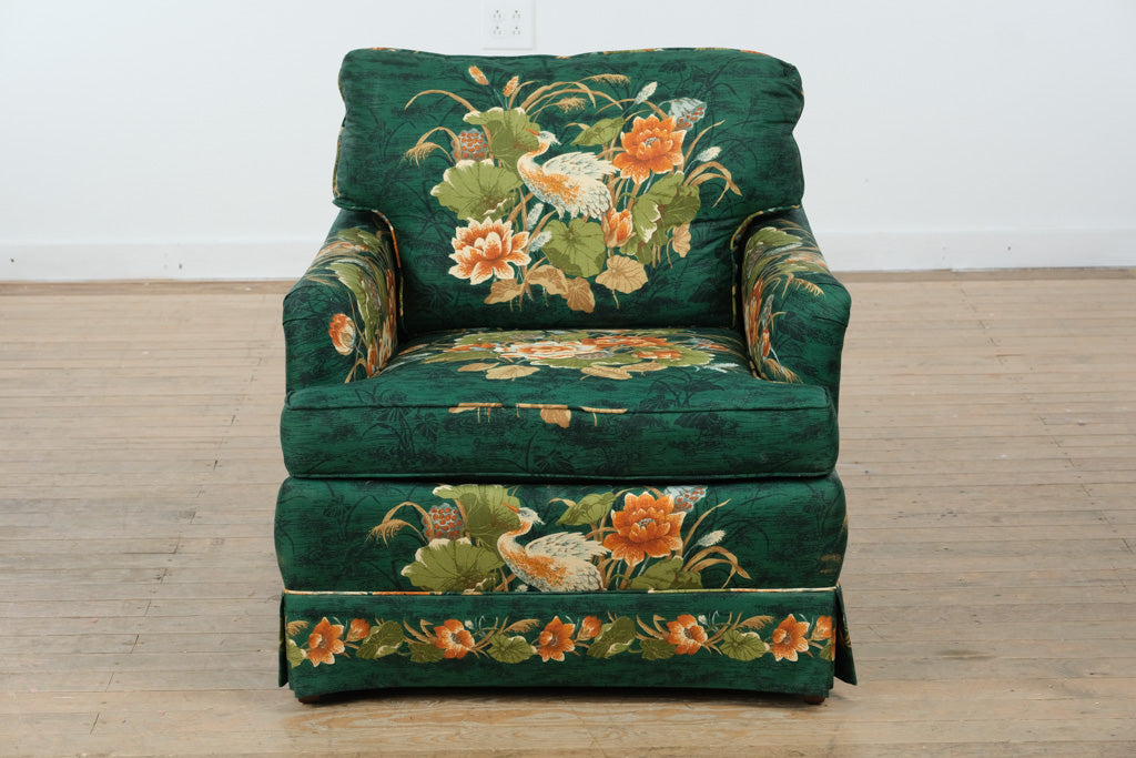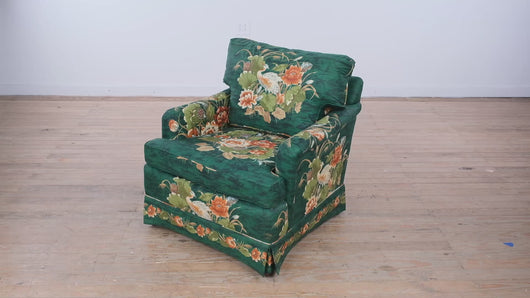 Radiating nostalgic charm and elevated craftsmanship, this Laine of Hickory accent chair blends vibrant botanical upholstery with a rich green backdrop, creating a statement piece that feels both luxurious and inviting. With its tailored skirting, deep seat cushion, and beautifully preserved fabric, it offers the perfect balance of comfort and timeless style.