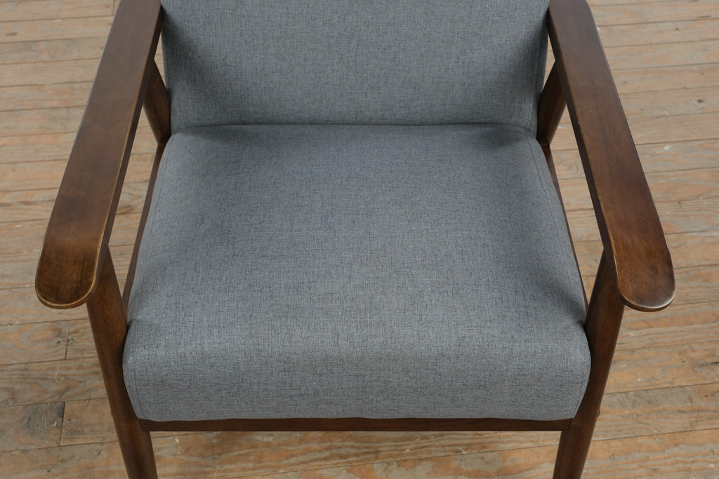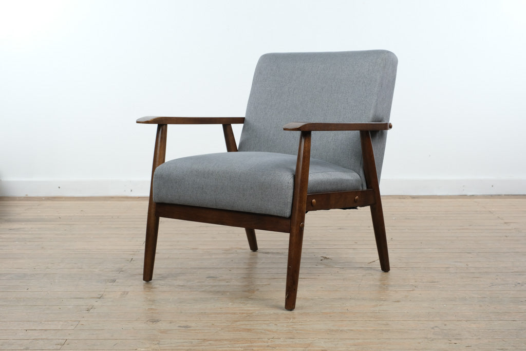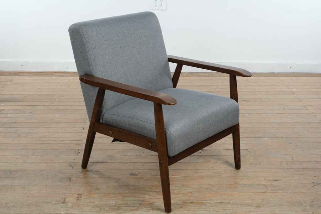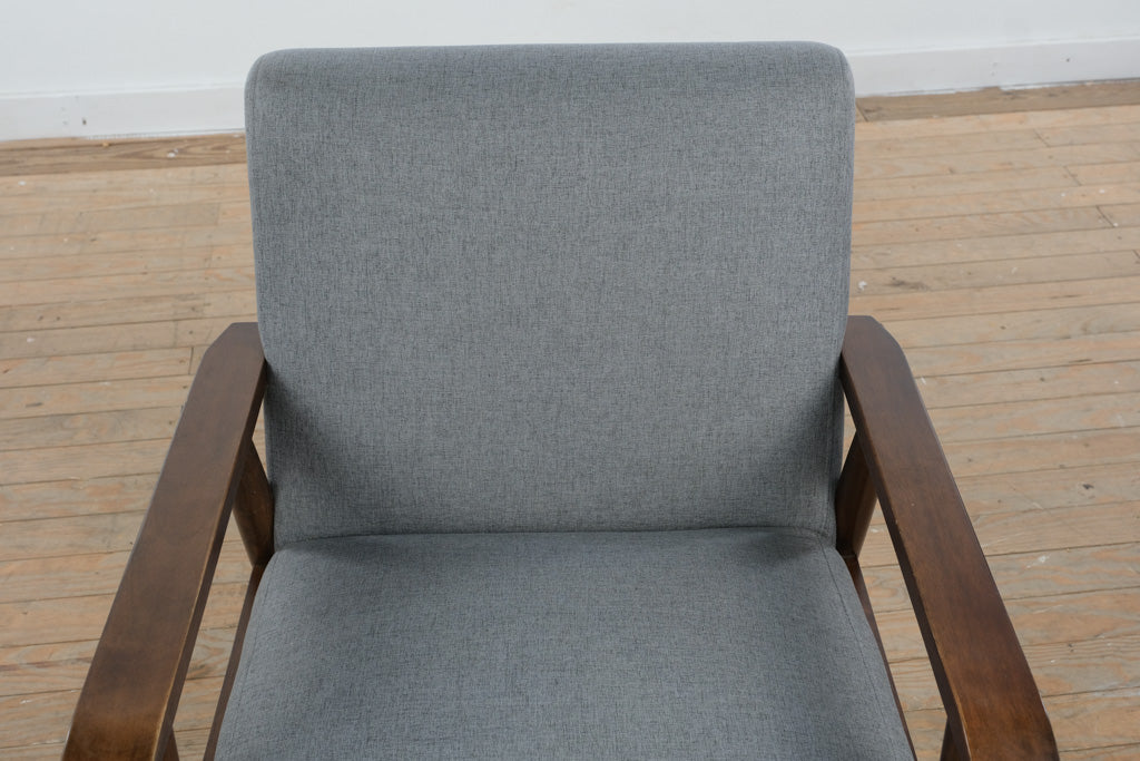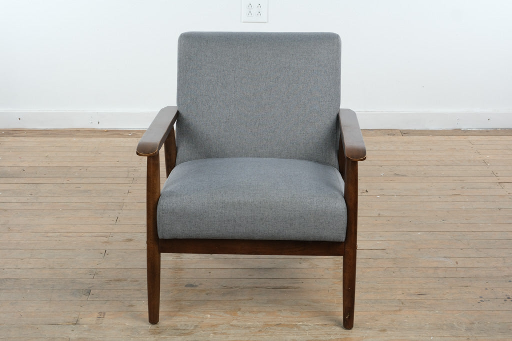 Crafted with a solid wood frame and gently angled arms, this chair reflects thoughtful construction and quality materials. The upholstered seat and back are generously cushioned for everyday comfort, while the neutral gray fabric provides durability and versatility. Manufactured in Malaysia in 2020, the piece balances contemporary production standards with classic MCM-inspired design.