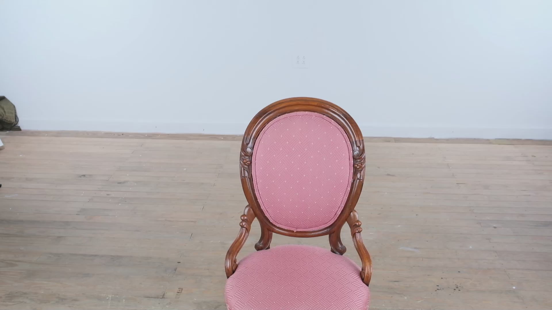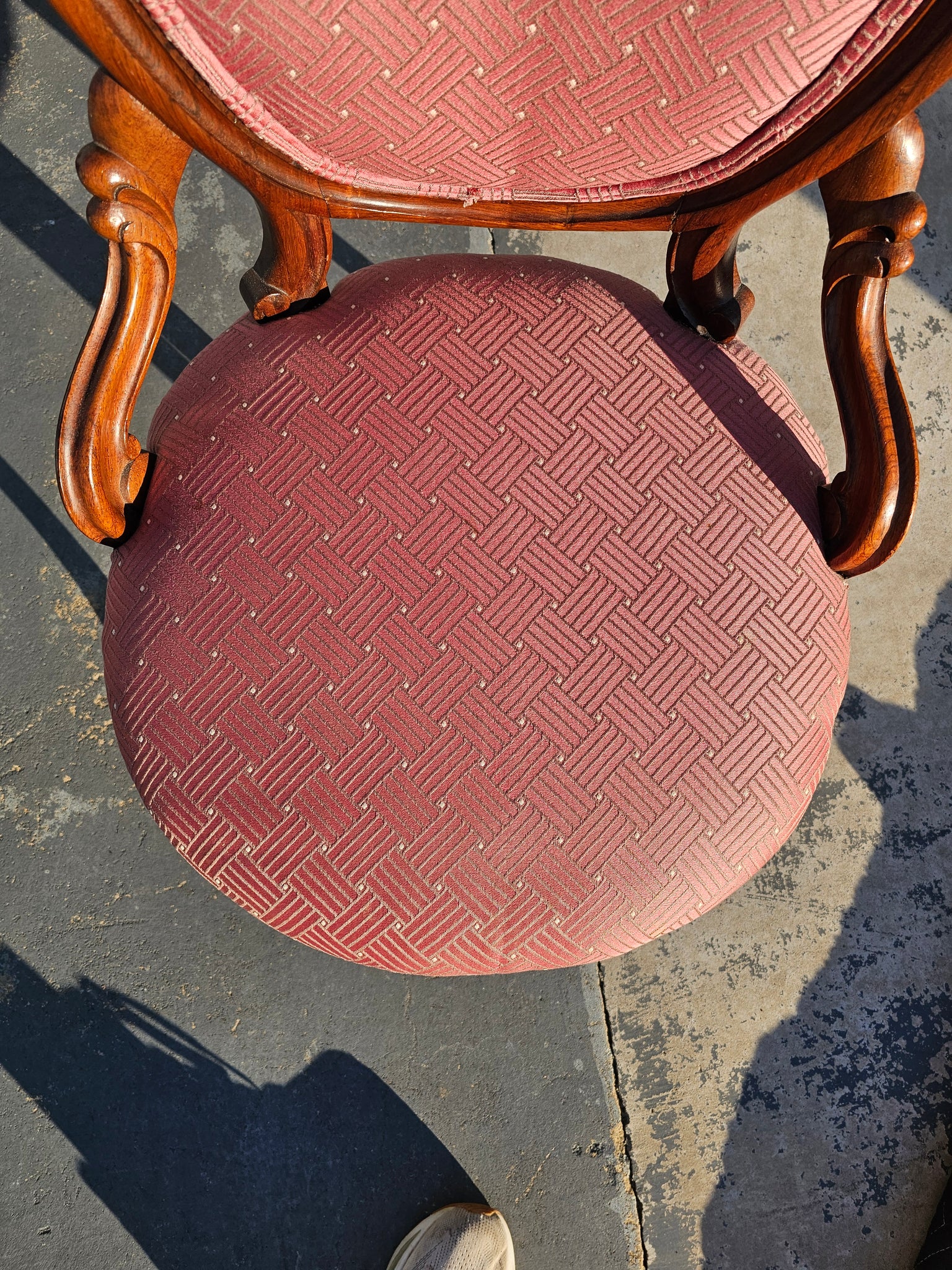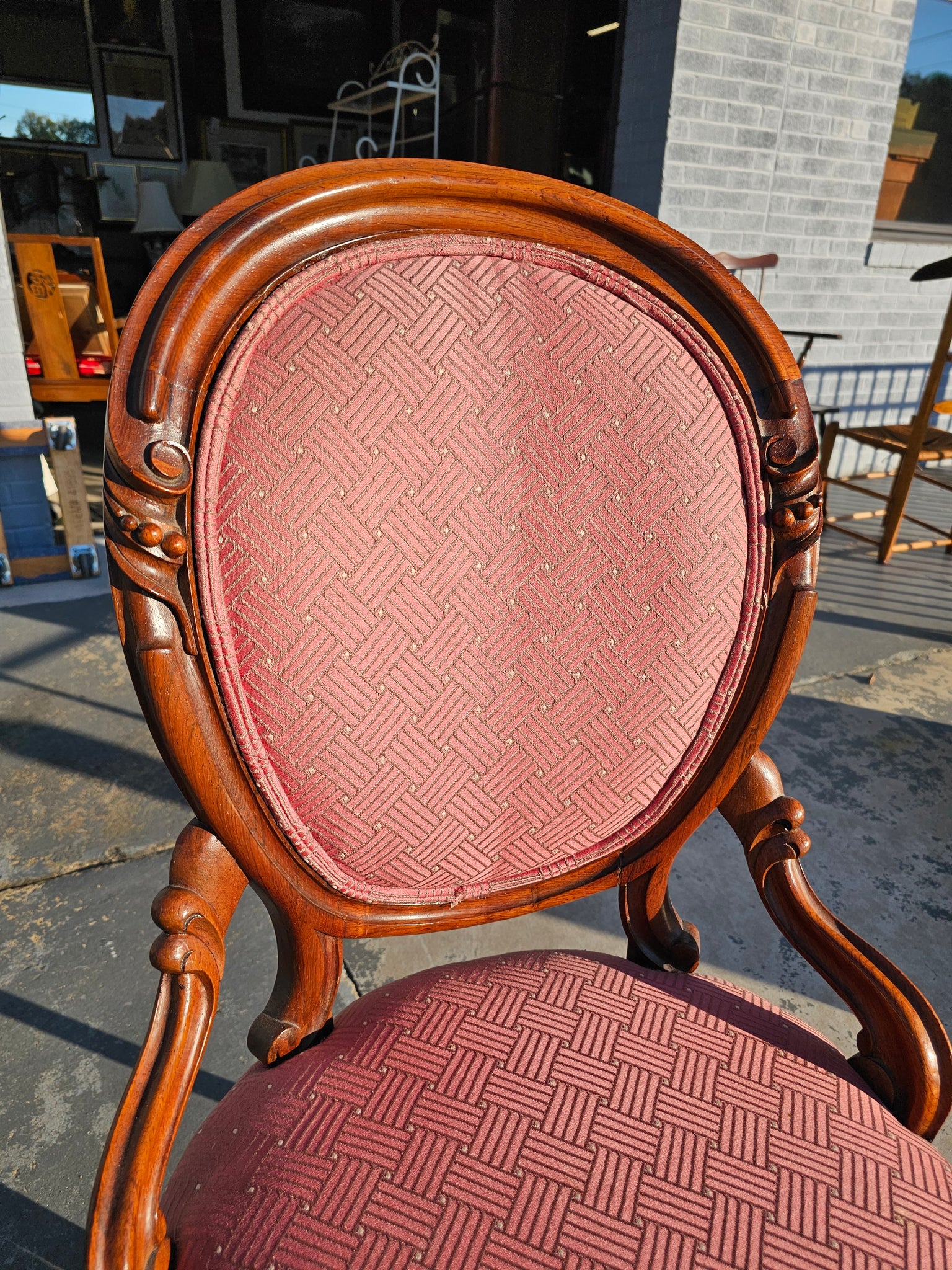 Expertly crafted from solid walnut, the chair’s frame displays rich carving and graceful shaping along the arms and crest. The upholstery is a deep rose damask with a subtle geometric pattern — in excellent condition and neatly fitted. Every element reflects fine craftsmanship and care, from the sturdy frame to the smooth casters that add both mobility and authenticity.