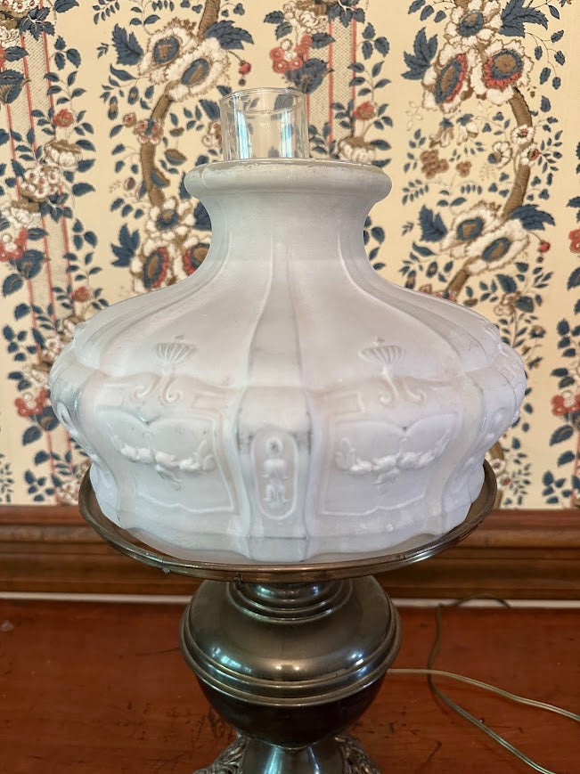 This elegant antique parlor lamp captures the charm of early 1900s lighting design, thoughtfully converted from oil to electric use. The lamp features a frosted white milk glass shade with intricate neoclassical relief details, including urns, floral garlands, and medallion-style motifs. The ornate cast metal base, finished in a soft pewter tone, complements the sculpted glass beautifully and adds a sense of grandeur and craftsmanship.