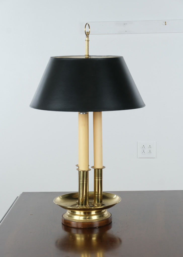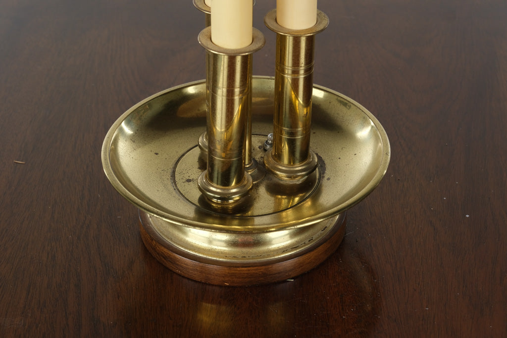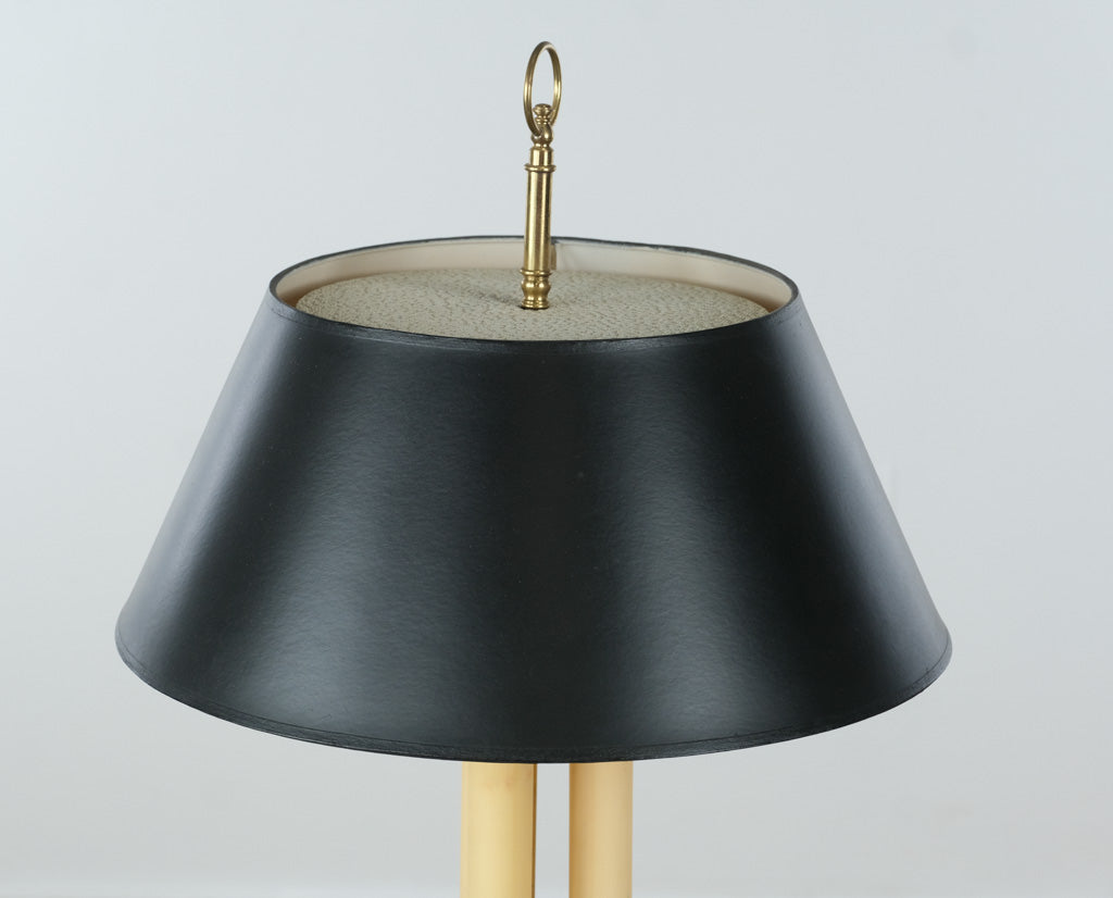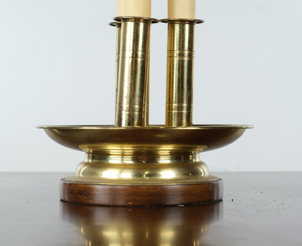 This handsome vintage table lamp showcases a classic triple candlestick design, beautifully crafted in polished brass and anchored by a substantial 10-inch round base with a warm wood accent. Standing approximately 29 inches tall, the lamp is crowned with a timeless black tapered shade that lends a refined, traditional silhouette.