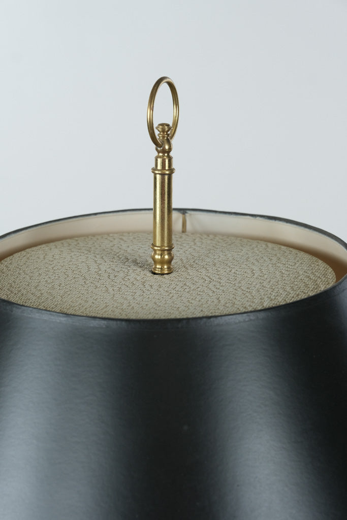 The three candle-style columns evoke early American and Colonial Revival influences, offering a stately presence well-suited for libraries, studies, living rooms, or bedside tables. The combination of brass, wood, and black shade creates a versatile yet distinguished look that complements traditional, transitional, and curated vintage interiors.