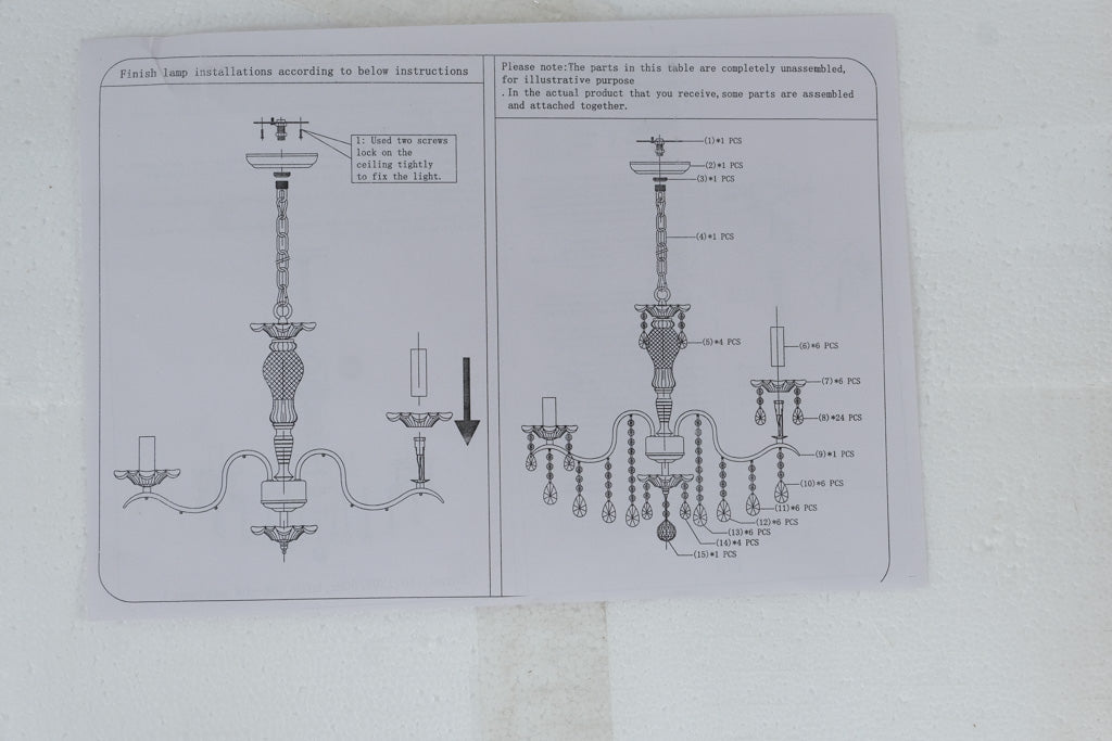 Add a touch of elegance to any room with this brand-new, never-installed 5-light chandelier, still packed in its original foam-lined box. The fixture features graceful sweeping arms, classic candle-style bulb holders, and multiple hanging crystal-style ornaments (individually wrapped), creating a sparkling traditional look once assembled.