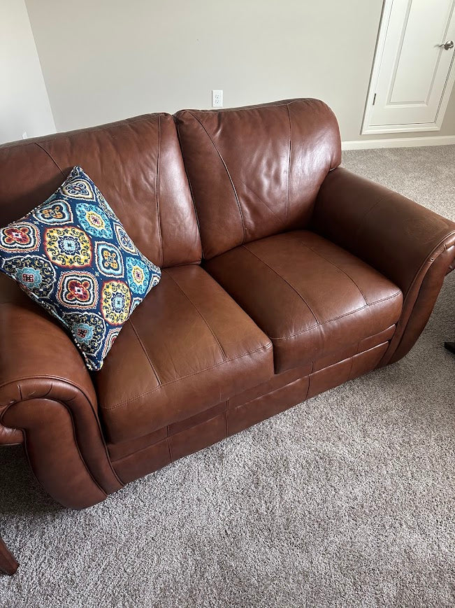 The Hamilton Rich Brown Leather Loveseat blends traditional rolled arms with clean, tailored lines, creating a versatile piece that works beautifully in both classic and transitional interiors. The rich brown leather pairs effortlessly with wood tones, neutral palettes, and layered textiles.