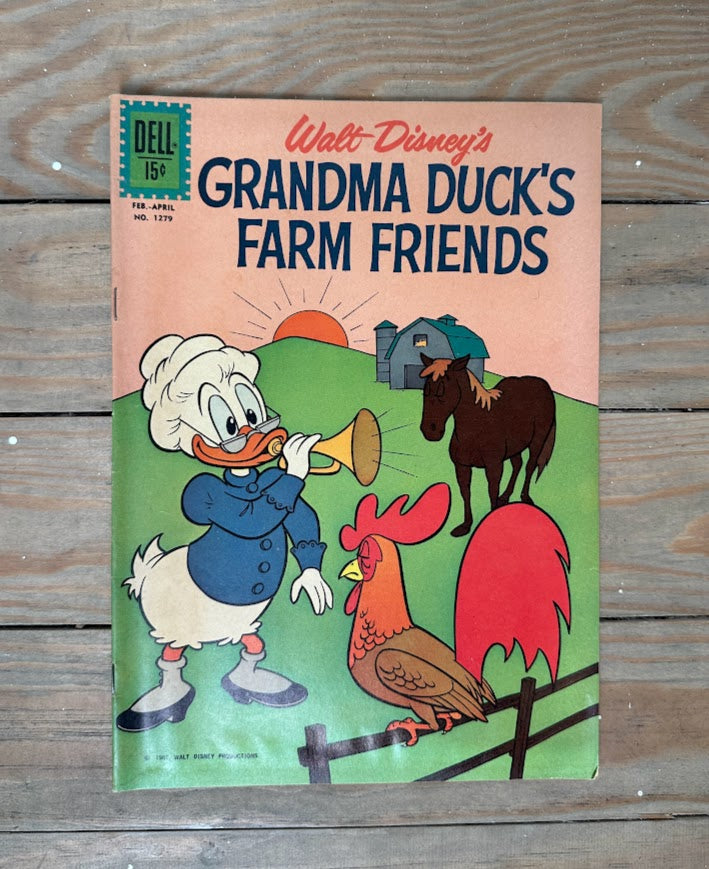 Bring home a warm slice of Disney nostalgia with this delightful 1961 Dell Grandma Duck’s Farm Friends No. 1279 comic. Featuring Grandma Duck in her classic frontier-style outfit as she greets the morning with a horn, this issue blends charming farmyard storytelling with the wholesome humor Disney fans love.