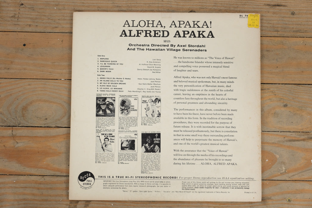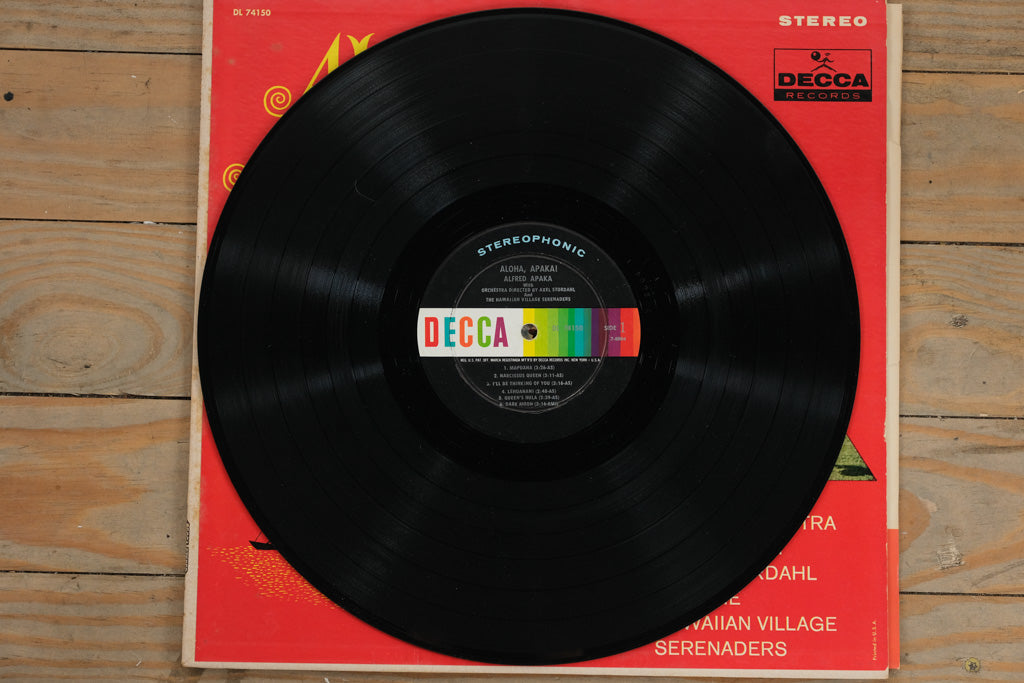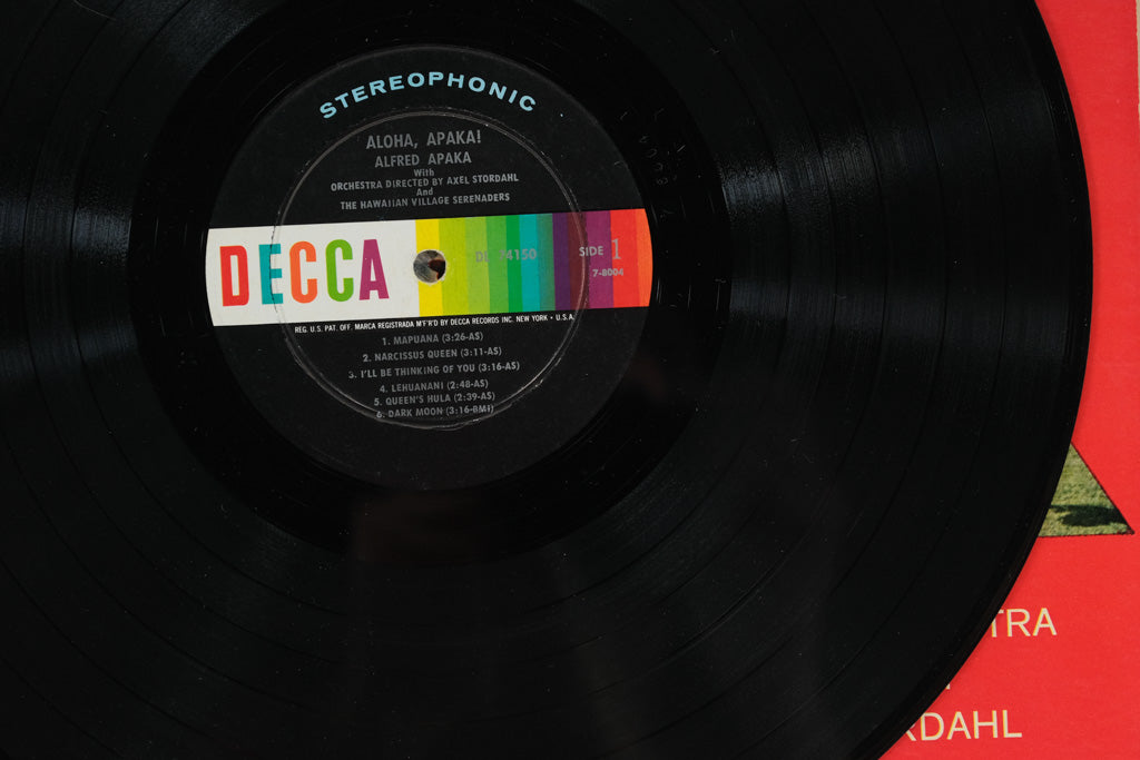 This Decca stereophonic LP (DL 74150) features Apaka backed by Orchestra Director Axel Stordahl and The Hawaiian Village Serenaders, delivering a lush tropical soundscape of traditional and popular Hawaiian favorites.
