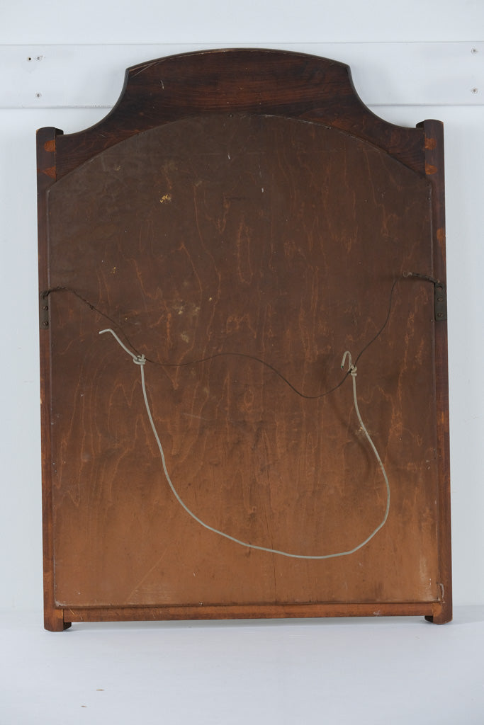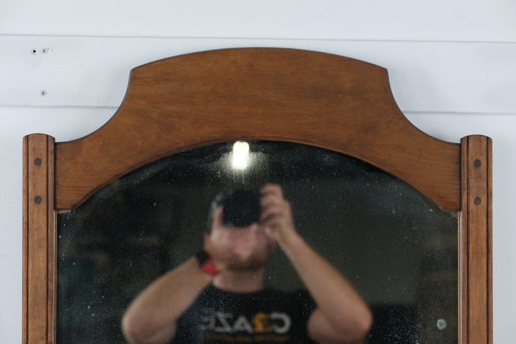 A beautiful example of classic craftsmanship, this Antique Field George Mirror features a solid wood frame with a gracefully arched top and simple pegged side details, reflecting early 20th-century American design. The warm, medium-brown finish brings out the natural wood grain, while the original mirror plate shows gentle age spotting and silvering, adding to its authentic vintage charm.