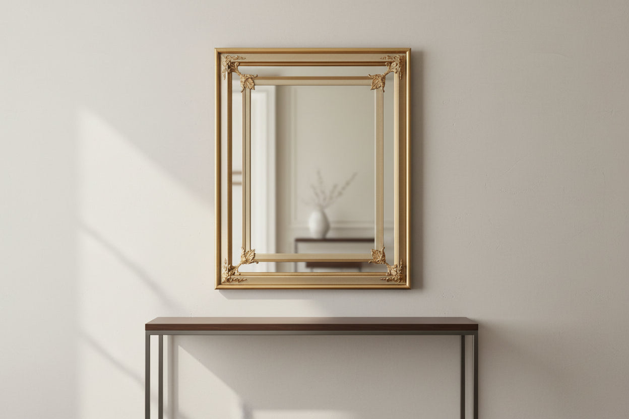 - Design: Multi panel mirror with raised inner frame and corner appliques