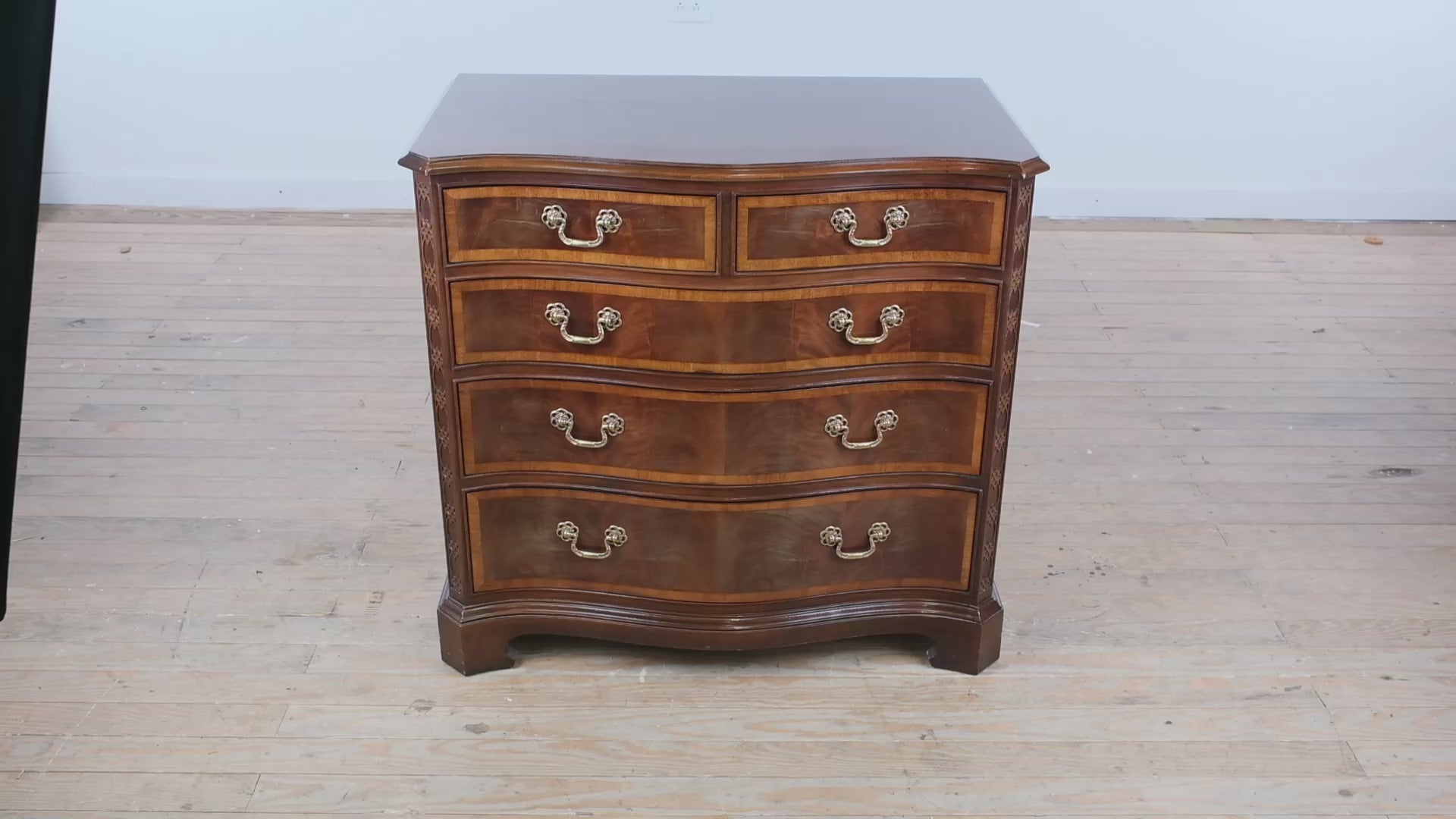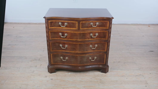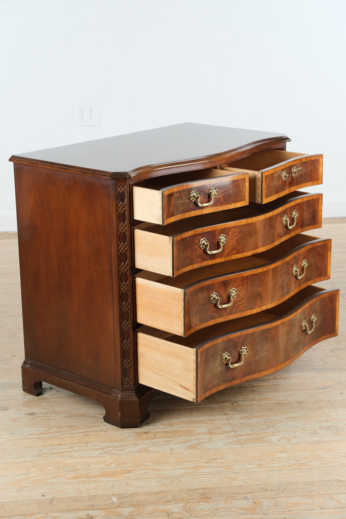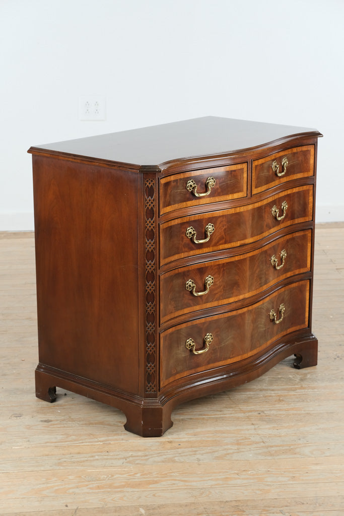 Slightly smaller than a traditional bachelor’s chest yet more substantial than a standard nightstand, this piece strikes the perfect balance of scale and versatility. The serpentine silhouette softens the room, while the banded drawer fronts and brass hardware add tailored sophistication.