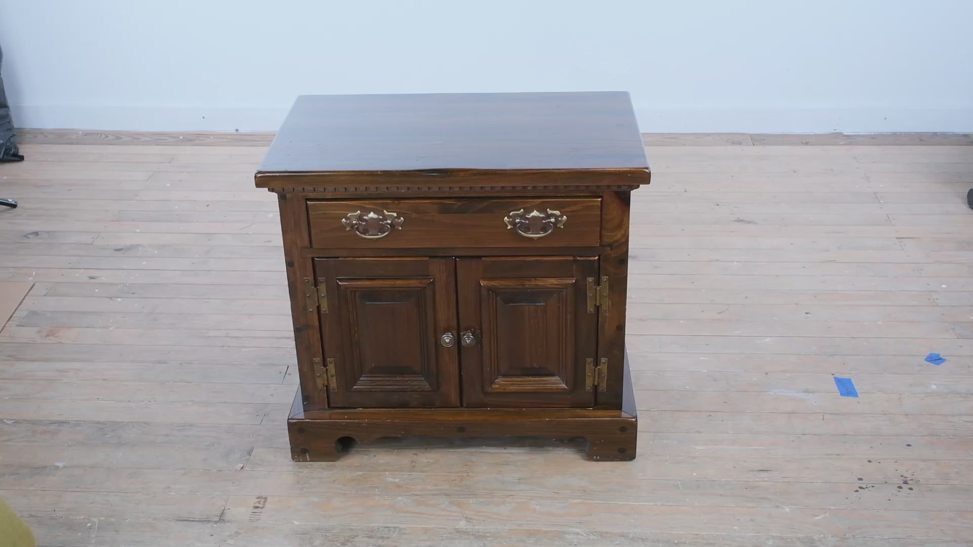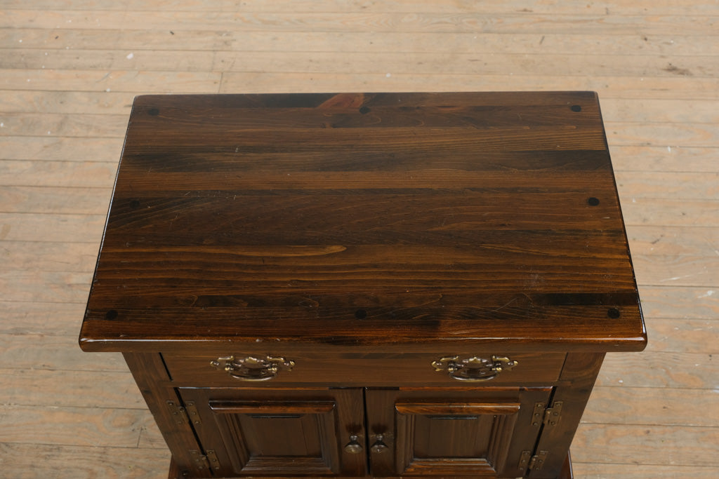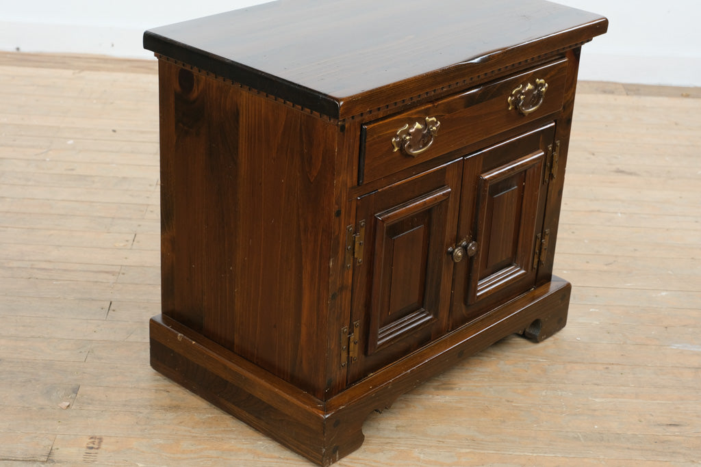 Crafted from solid Bennington pine, this piece showcases expert joinery and enduring construction. The design features a spacious upper drawer with original brass hardware and a lower double-door cabinet for concealed storage. The paneled doors and molded trim along the top edge highlight thoughtful craftsmanship rooted in quality and utility.