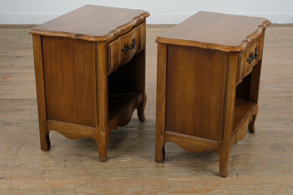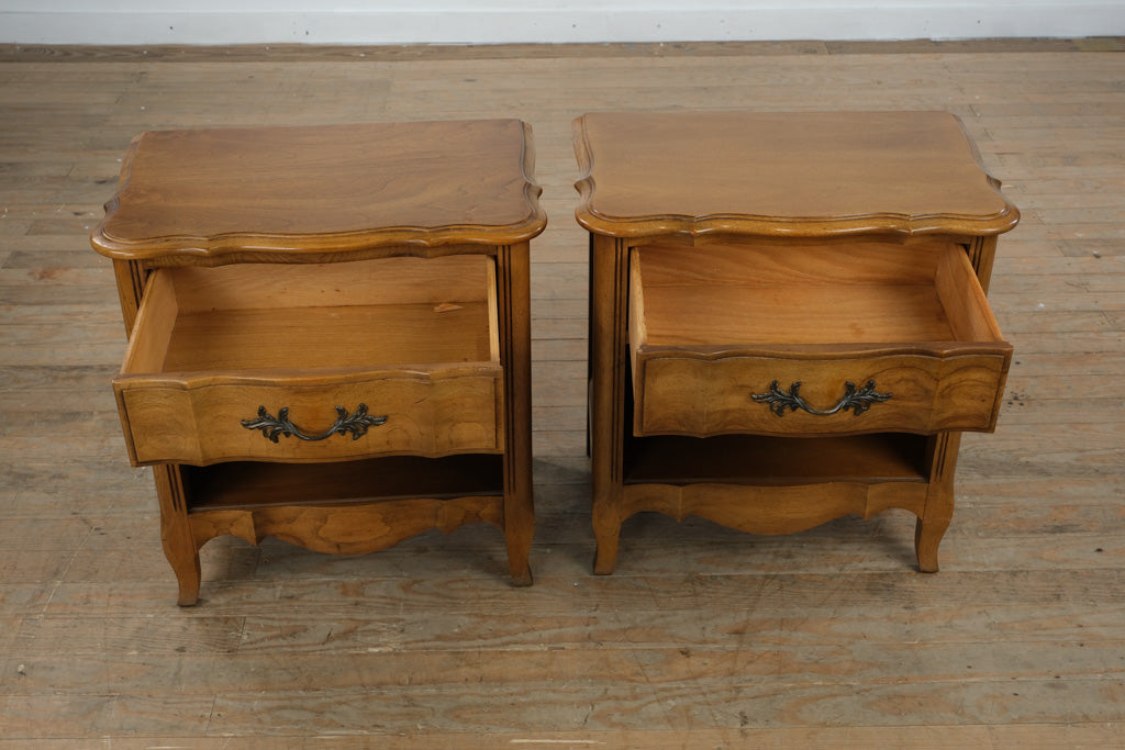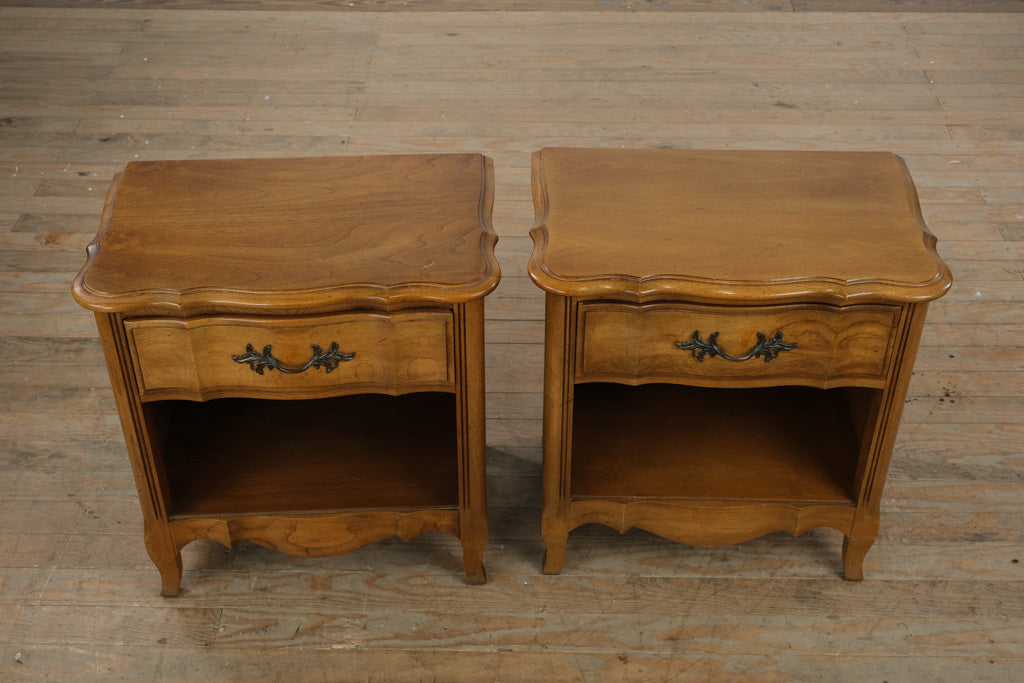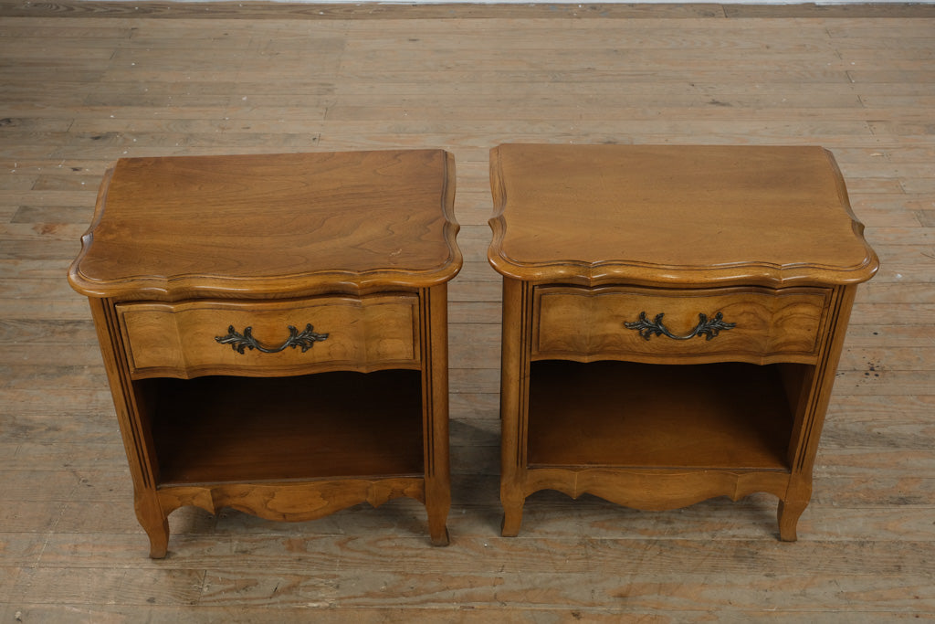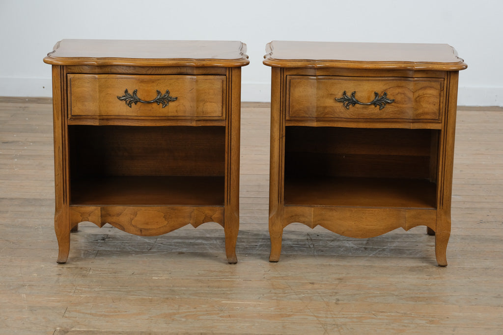This charming pair of 1962 Thomasville French Provincial nightstands brings the warm elegance of mid-century craftsmanship into any bedroom or living space. Made during a period when Thomasville was celebrated for its high-quality hardwood construction and refined styling, these tables feature classic serpentine fronts, cabriole legs, and beautifully aged brass hardware. Their soft, sculpted edges and graceful silhouettes give them the timeless French cottage character that collectors love.