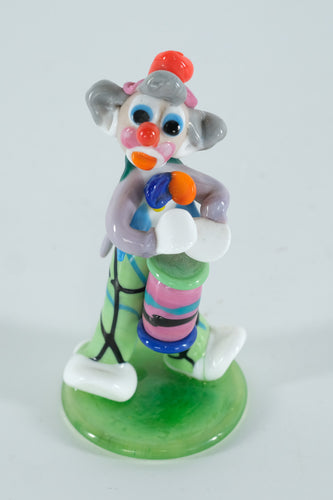 Hand-Blown Art Glass Clown Figurine with Colorful Drum – Vibrant Circus Miniature on Green Base
