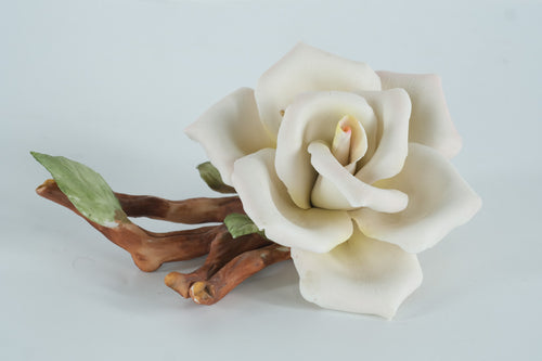 Capodimonte-Style Porcelain Rose Sculpture on Driftwood Branch – Handcrafted White Rose Art