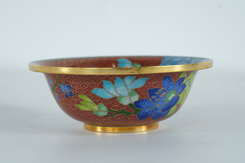 Cloisonné Bowl with Blue Lotus Flowers & Golden Bird – Hand-Enameled Floral Art on Red Ground