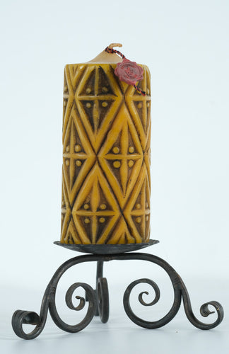 Mid-Century German “Handarbeit” Carved Wax Pillar Candle on Wrought Iron Stand – Artisan 100-Jahre Seal (9.5")