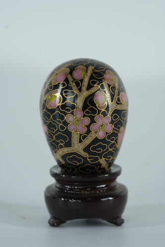 Miniature Cloisonné Egg with Pink Plum Blossom Design – Black Enamel Floral Art on Stand