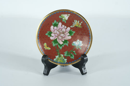 Cloisonné Plate with Pink Peony & Butterflies – Hand-Enameled Floral Art on Red Ground