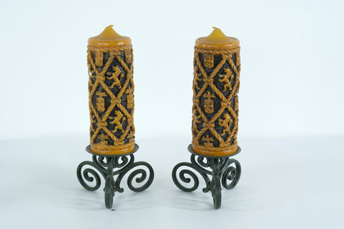 Mid-Century European-Style Sculpted Wax Candles on Japanese Cast Iron Holders – Vintage Pair (13.5")