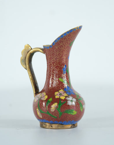 Cloisonné Miniature Ewer Pitcher – Red Enamel with Floral & Bird Motif – 3" Tall