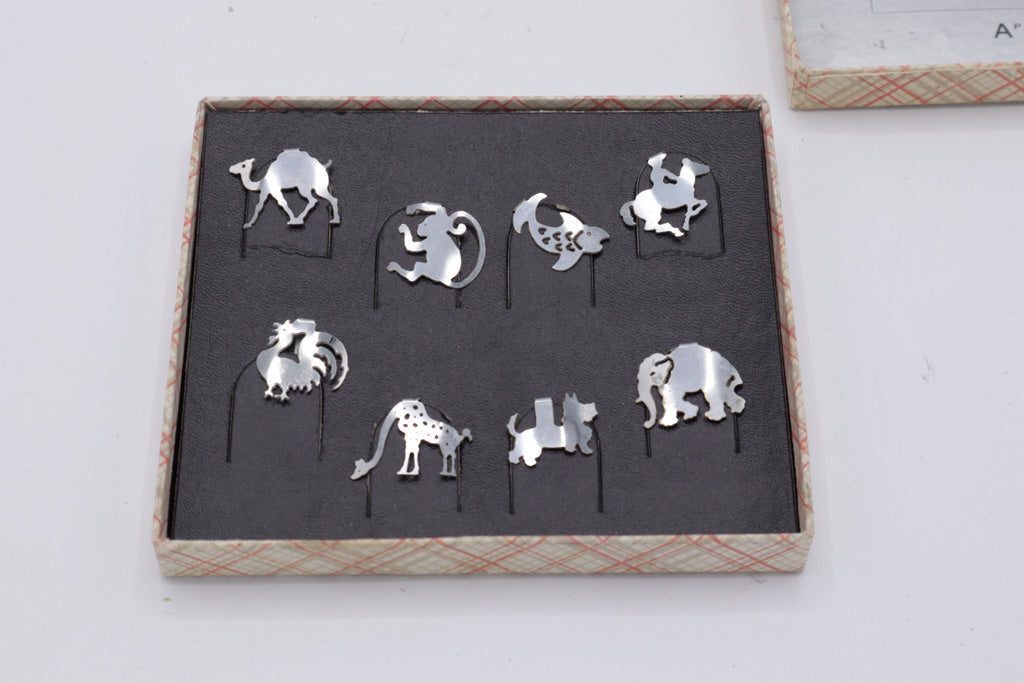 Set includes 8 stainless steel animal-shaped clips: camel, monkey, fish, rooster, horse, elephant, dog, and cat.