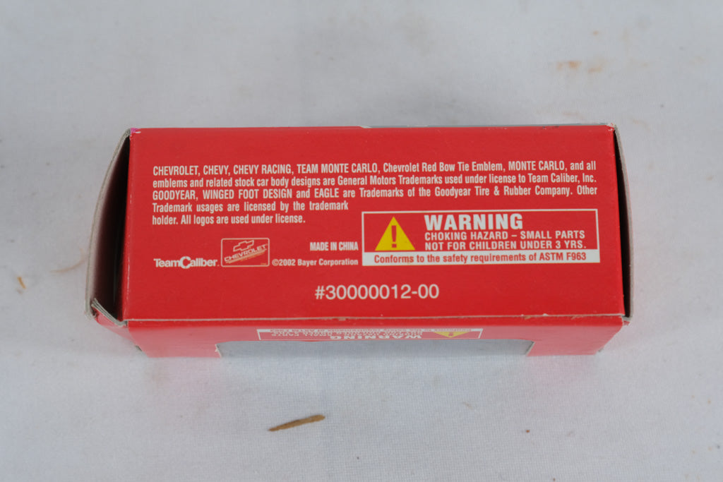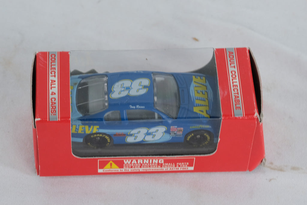 Celebrate a decade of racing excitement with this 2002 Team Caliber Special 10th Anniversary Edition die-cast car, featuring the #33 Aleve Chevrolet Monte Carlo driven by Tony Raines. Created exclusively for Bayer Consumer Care’s 10th anniversary in racing, this limited-edition 1:64 scale model captures the sleek lines and vivid sponsor graphics of the real NASCAR stock car. Packaged in its original red display box, this collectible was a promotional “Free with Purchase” item and remains a sought-after piece for racing and die-cast enthusiasts alike.