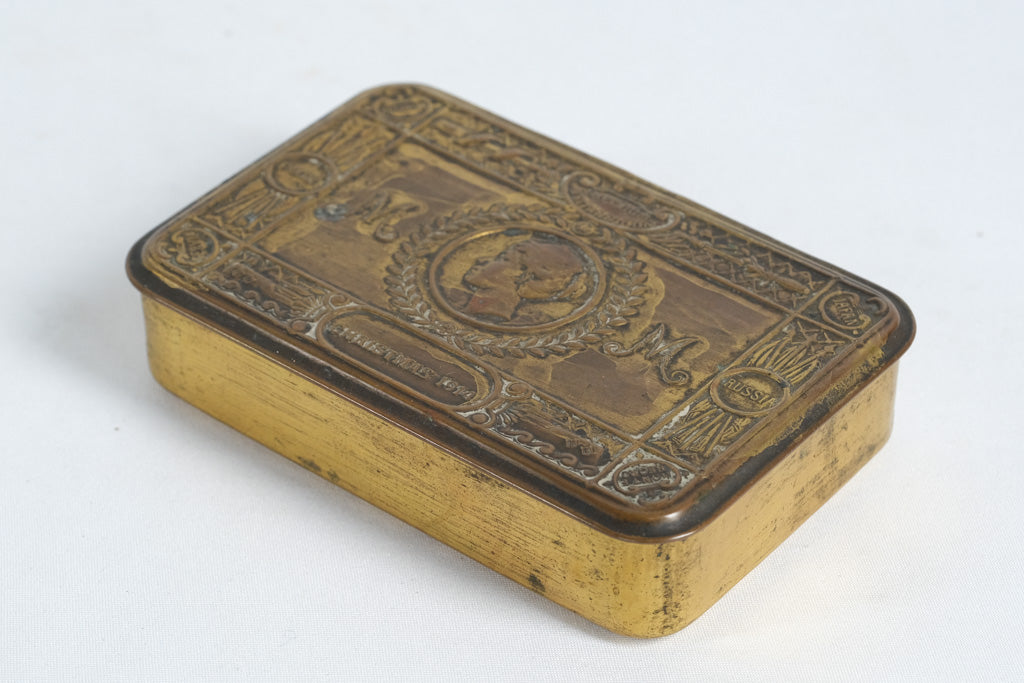 This historic Princess Mary Christmas Gift Fund tin was issued in 1914 to British troops during World War I. The embossed brass tin features a central portrait of Princess Mary surrounded by laurel wreaths and the royal monogram "M". At the top is the inscription “Imperium Britannicum” — Latin for “The British Empire” — underscoring Britain’s unity and global presence during the war.